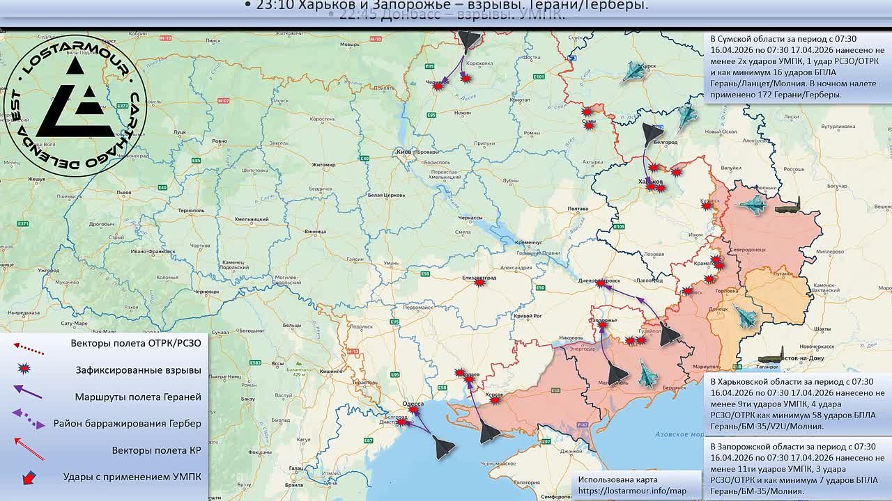 Анимированная схема ударов по территории Украины 16 апреля 2026 - 17 апреля 2026 года.
