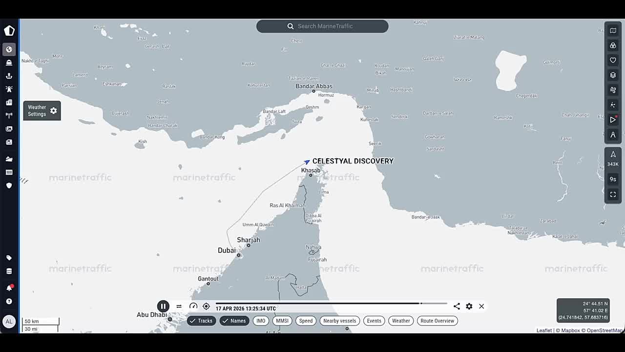 MarineTraffic сообщил, что круизный лайнер Celestyal Discovery стал первым пассажирским судном, прошедшим через Ормузский пролив с начала конфликта (видео 1). Лайнер был без пассажиров, их высадил еще в начале марта. Более 1000 человек были вынуждены самостоятельно выбираться в войну из Дубая. Шло судно вдоль берегов ОАЭ и Омана, хотя по данным Ирана, согласованный маршрут проходит вдоль иранского берега (фото 2).