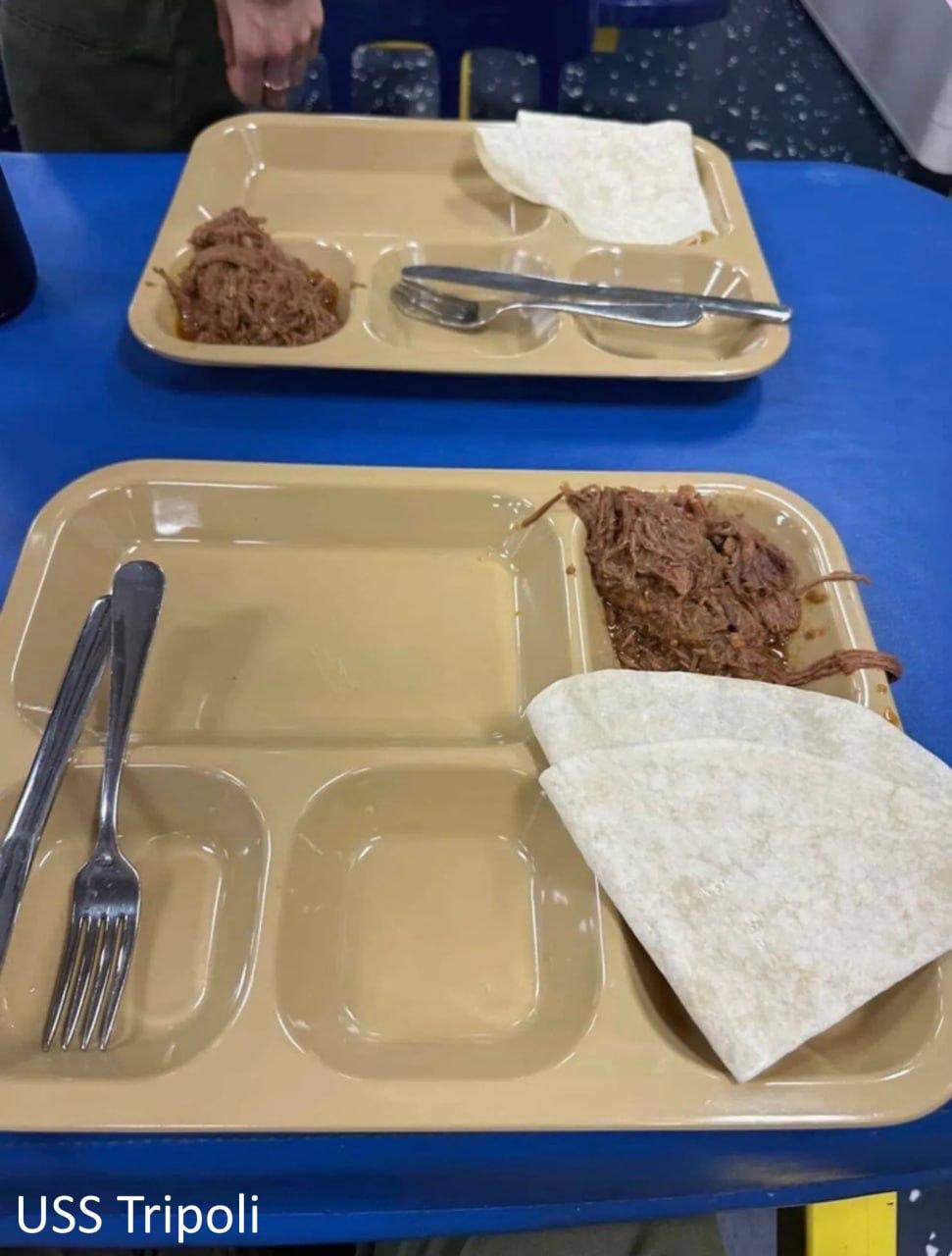 Тем временем, на американских авианосцах на Ближнем Востоке заканчивается еда. По данным USA Today, на кораблях USS Tripoli (в море около 5 недель) и Abraham Lincoln (рекорд развёртывания авианосца со времён Холодной войны — 295 дней в море) в Аравийском море острая нехватка продовольствия. Морпехам подают полупустые подносы — горстка моркови, кусочек мяса, лепешка. Свежих овощей и фруктов нет, сломана кофе-машина, не хватает средств гигиены. Моряки делят еду поровну, моральный дух якобы стремительно падает. Семьи даже собирают посылки, но доставка на военные адреса Ближнего Востока приостановлена с апреля на неопределённый срок.