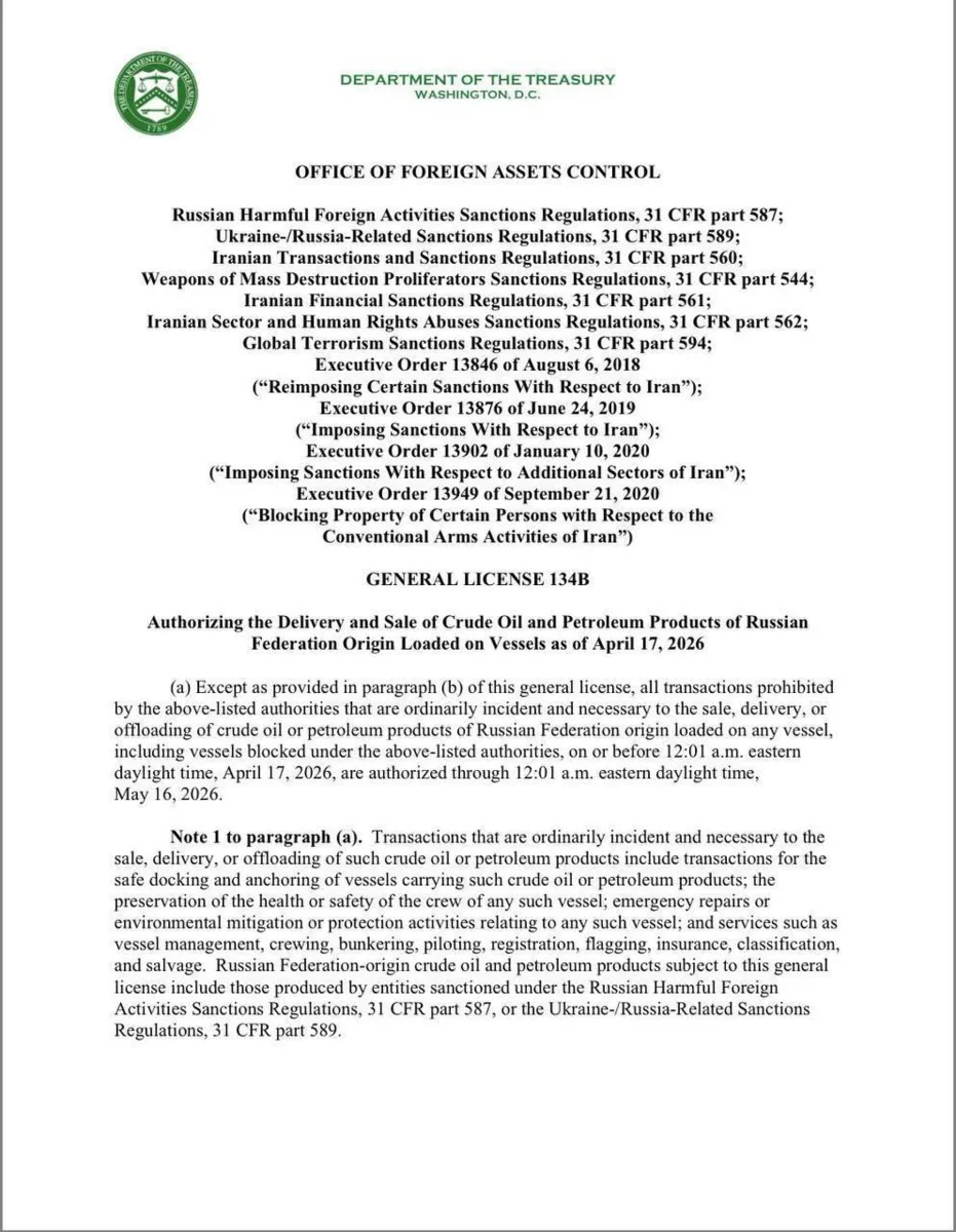Минфин США разрешил до 16 мая продажу, перевозку и выгрузку российской нефти. В документе приведены условия: