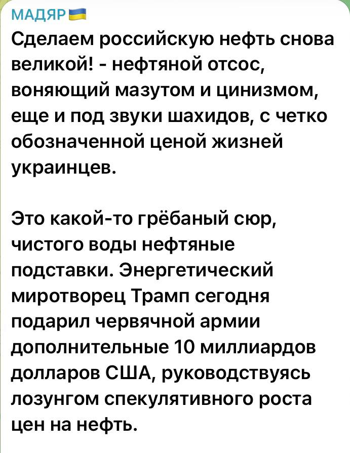 В ответ на продление снятия американских санкций с российской нефти хуторской террорист Мадяр разразился гневным спичем и пообещал наносить еще больше дроновых ударов по каждому километру нашего тыла.
