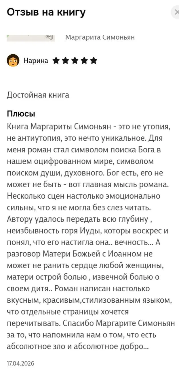 И остальных читателей тоже прошу — оставляйте отзывы на OZON, Wildberries, Litres, Читай-город или Буквоед и присылайте скриншоты в комментарии в моем Telegram-канале 'Литература и история', а я пришлю вам копию романа с моей подписью.
