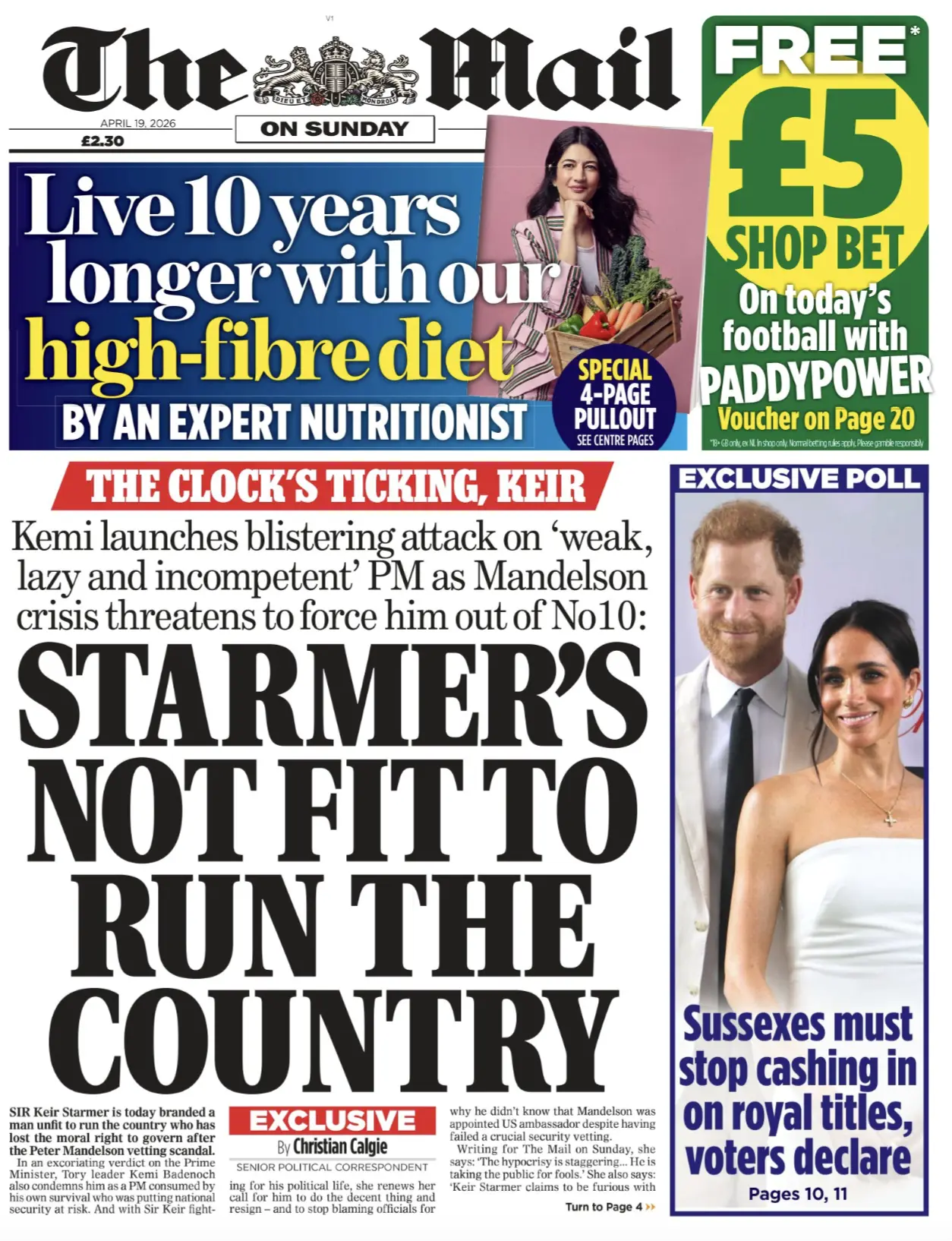 «Стармер не пригоден для управления страной». С таким очевидным выводом с первой полосы газеты The Mail on Sunday обращается к британцам предводительница Консервативной партии Кеми Баденок.