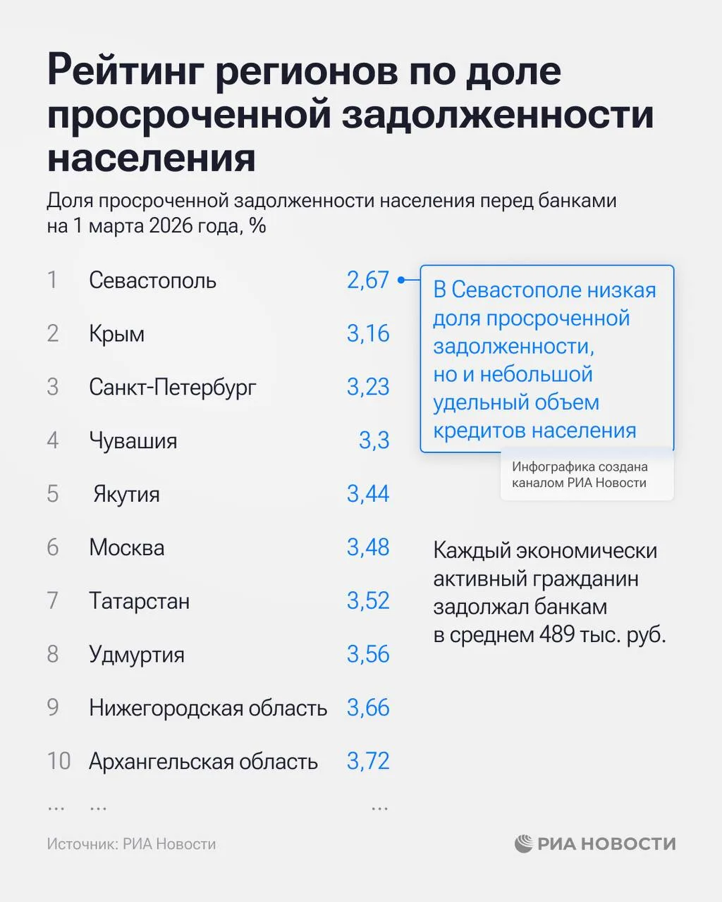 Регионом-лидером по платежной дисциплине стал Севастополь, где доля просроченных кредитов физическим лицам составляет 2,67%. Также в первых строчках рейтинга - Крым (3,16%) и Санкт-Петербург (3,23%).