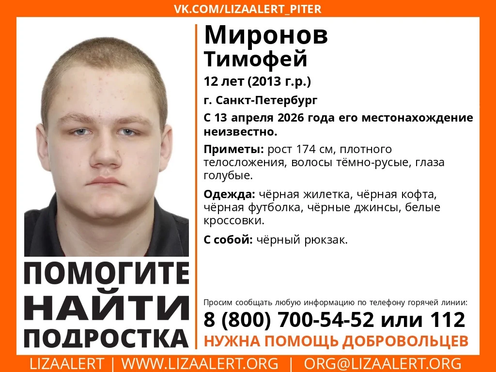Приметы ребенка: рост 174 сантиметра, плотное телосложение, темно-русые волосы и голубые глаза. В день исчезновения он был одет в белые кроссовки, черные жилетку, кофту, футболку и джинсы. С собой был черный рюкзак.