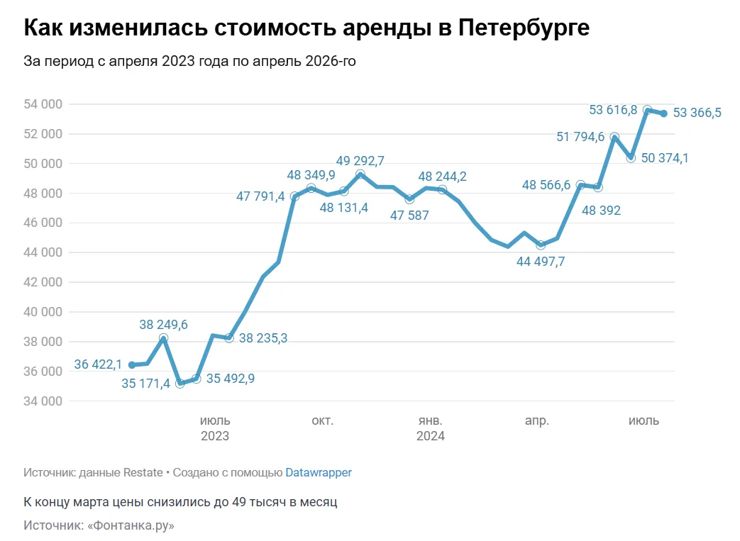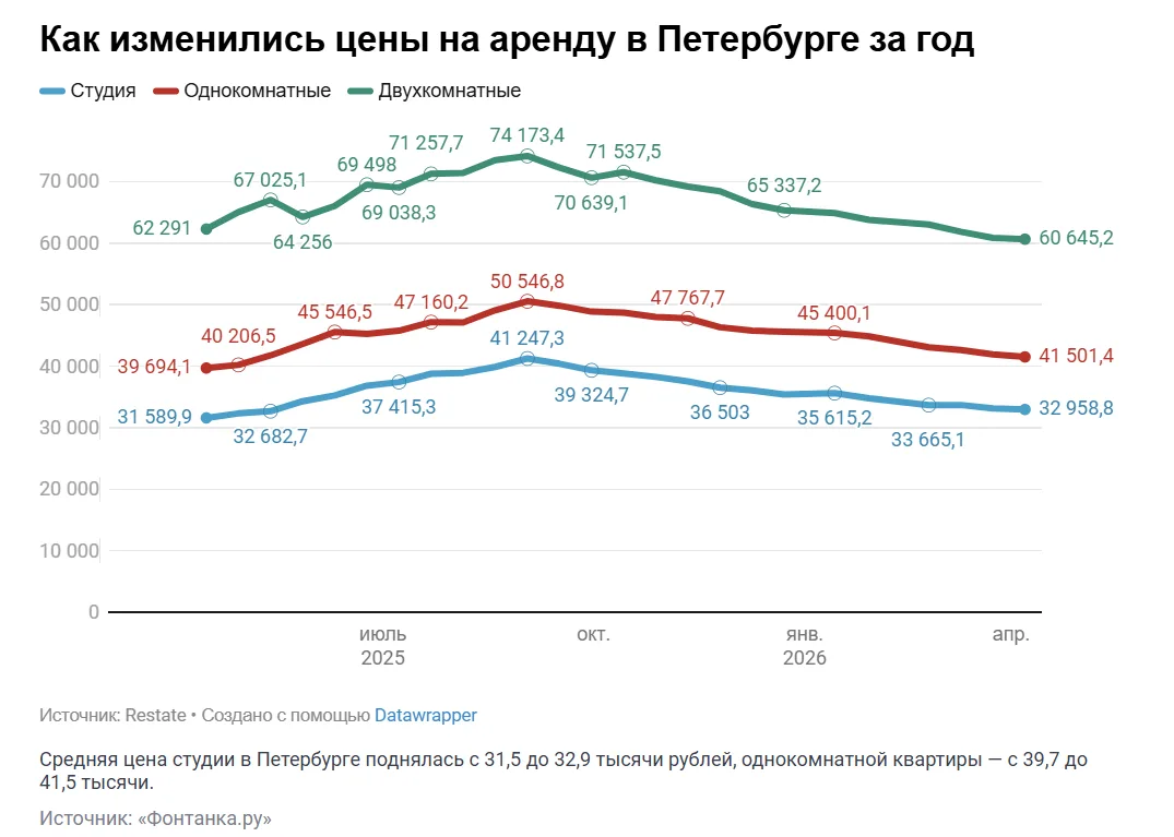 На начало апреля средняя стоимость съема квартиры в Петербурге составляла 48 700 рублей в месяц. Год назад петербуржцы платили в среднем 52 565 рублей, а пик пришёлся на сентябрь 2025-го, тогда цены доходили до 62 тысяч.