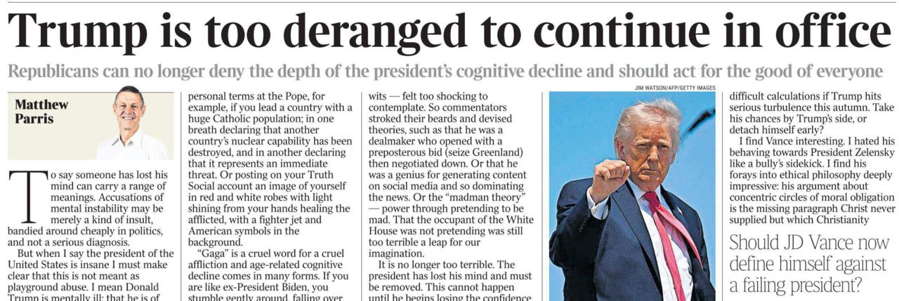 Автор пишет, что с любой иной должности Трампа при таком упадке рассудка давно уволили бы: «Представьте, что он работает в банке. Или пилотом British Airways. Или вашим местным адвокатом или врачом общей практики. Ни на одной из этих должностей ему бы не позволили продолжать работать».