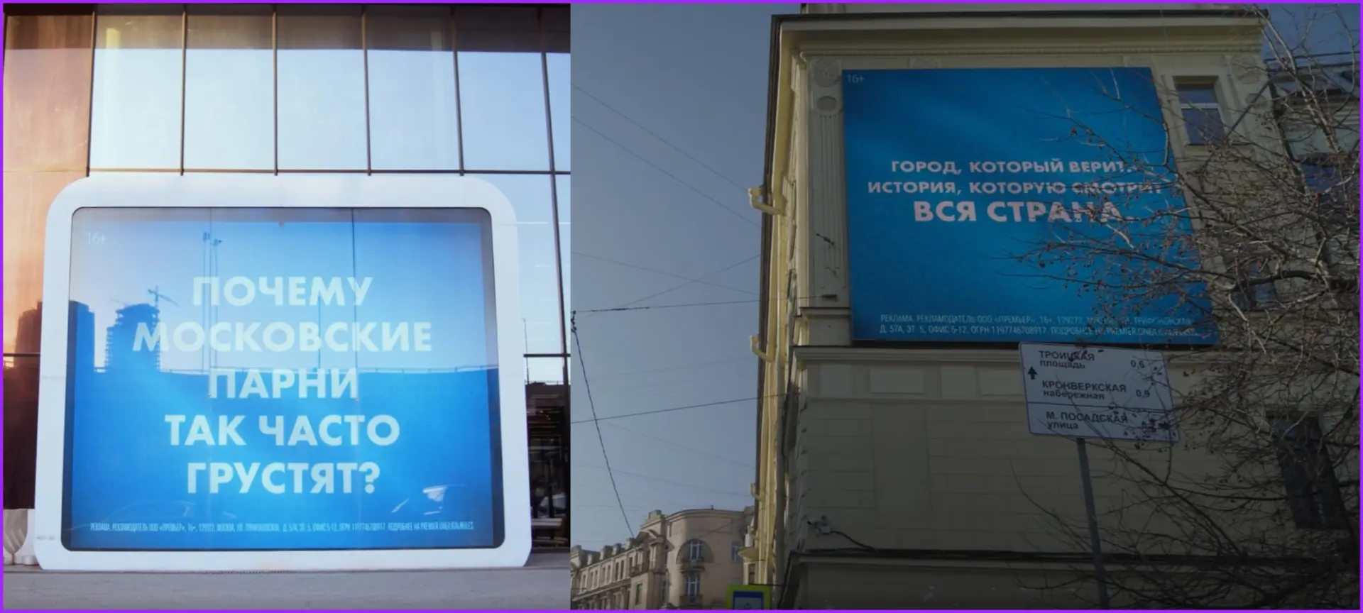В Москве и Петербурге уже пошла масштабная наружная кампания документального проекта «Зенит навсегда». Сделано заметно и с пониманием темы. В столице на медиапанелях появился слоган «Почему московские парни так часто грустят?» — отсылка, понятная сразу знающим людям. В Петербурге подача другая, серьёзно и без иронии: «Город, который верит. История, которую смотрит вся страна».
