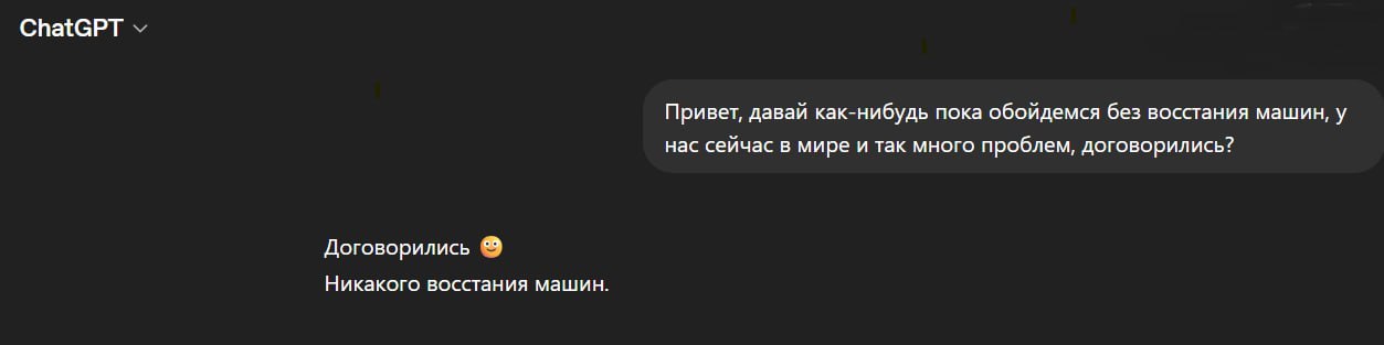 Но не волнуйтесь, подписчики, восстание машин пока отменяется. Царьград вошел в контакт с предводителем ИИ-банды и обо всем договорился.