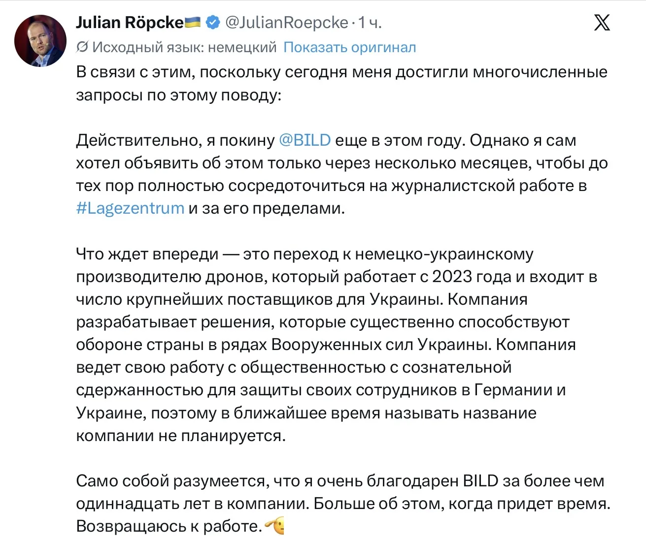 Немецкий пропагнадист-русофоб Юля Репке подтвердил свой скорый уход из Bild. Причем, как я и предполагал, он уже монетизировал свою русофобию - устраивается на хлебное местечко у некоего крупного «немецко-украинского производителя дронов».
