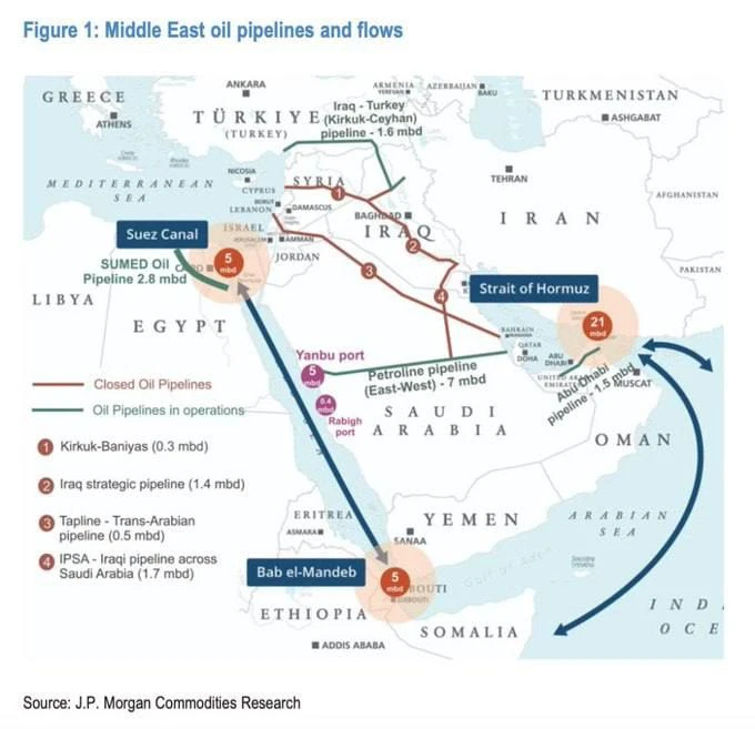 Агентство Tasnim пригрозило, что Иран тоже нанесет удары, что в общей сложности с блокировкой Ормузского пролива может вывести из строя 32% мировых поставок нефти (на фото). Речь о возможных ударах по трубопроводу Янбу в Саудовской Аравии и объекту Фуджейра в ОАЭ, которые используются для обхода Ормузского пролива. По Фуджейре Иран уже бил несколько раз.