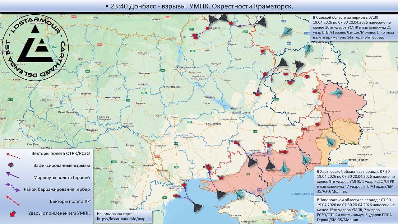 Анимированная схема ударов по территории Украины 19 апреля 2026 - 20 апреля 2026 года.