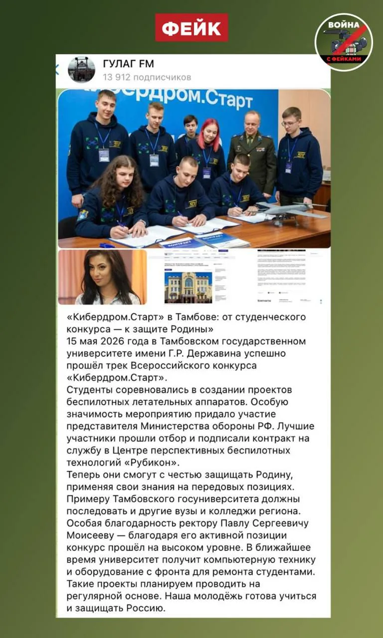 Для убедительности подделка сопровождается отредактированным скриншотом сайта Тамбовского госуниверситета с фейковым содержанием об отборе участников конкурса в Центр перспективных беспилотных технологий «Рубикон».