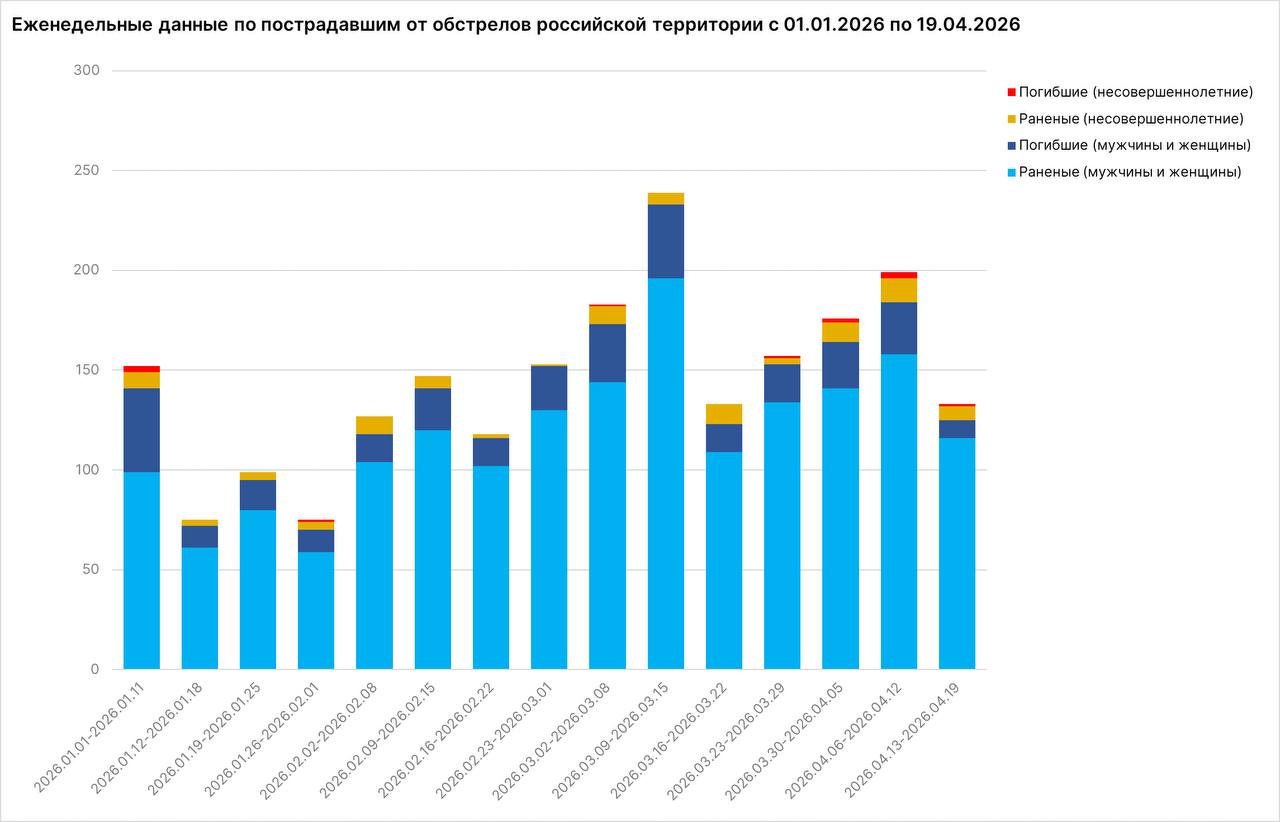 За неделю с 13 по 19 апреля от обстрелов украинских нацистов пострадали 133 мирных жителя: ранены 123 человека, в том числе 7 несовершеннолетних, погибли 10 человек, в том числе 1 ребенок. Всего по гражданским объектам на российской территории ВФУ выпустили не менее 3 097 боеприпасов.