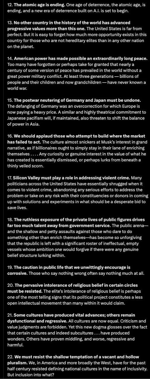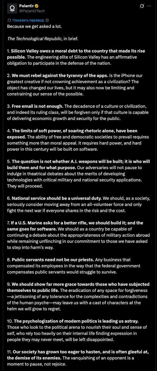 IT-гигант Palantir, тесно сотрудничающий с Пентагоном (имеет контракт с армией США на $10 млрд), опубликовал в X тезисы из книги своего CEO Александра Карпа «Технологическая Республика» — манифест в пользу милитаризации технологий, ремилитаризации Запада и введения всеобщей воинской повинности в США.