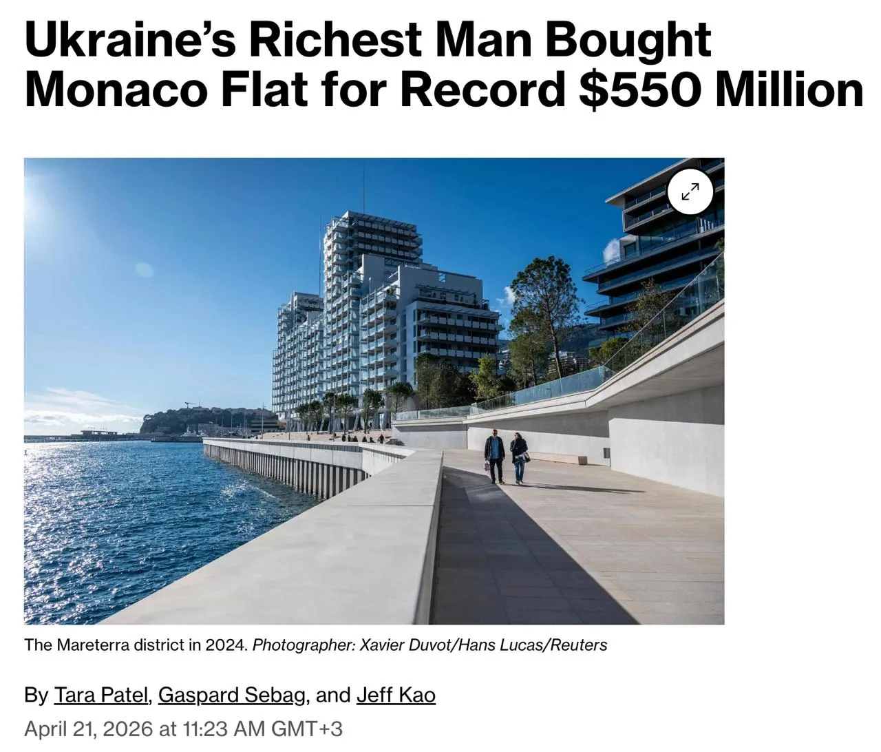 Ринат Ахметов купил квартиру в Монако за рекордные 550 миллионов долларов, сообщает Bloomberg.