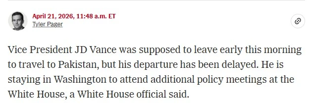 ‘Вэнс должен был вылететь сегодня рано утром в Пакистан, но его отъезд был отложен. Он останется в Вашингтоне для участия в дополнительных политических совещаниях в Белом доме’ – Белый дом.