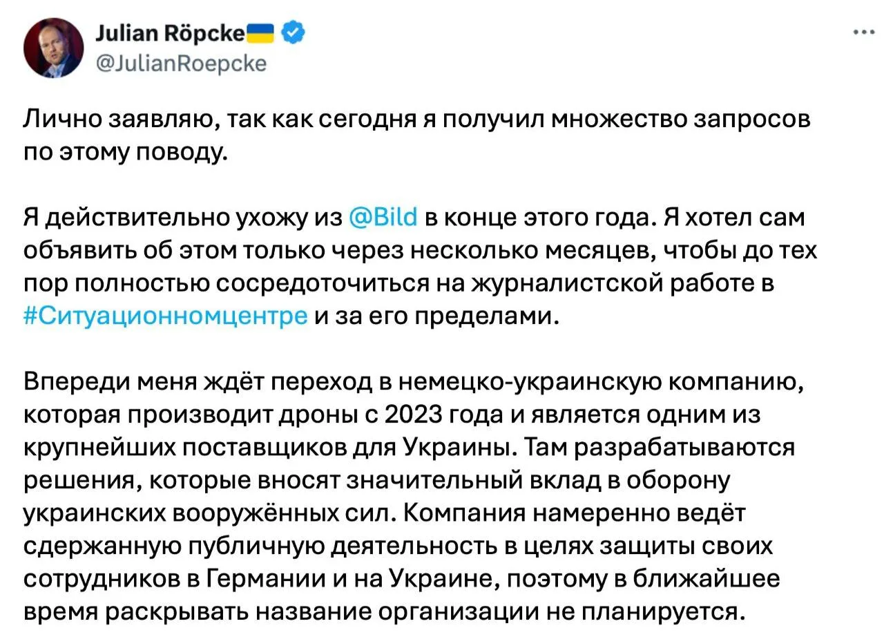 Пропагандист Bild Юлиан Рёпке покидает издание, которому отдал 11 лет жизни. Его «ждёт переход в немецко-украинскую компанию, которая производит БПЛА с 2023 года и является одним из крупнейших поставщиков для Украины». (Расследование Папочки показало, что это может быть Quantum Frontline Industries, но Рёпке принципиально не раскрывает детали — в целях конфиденциальности.)