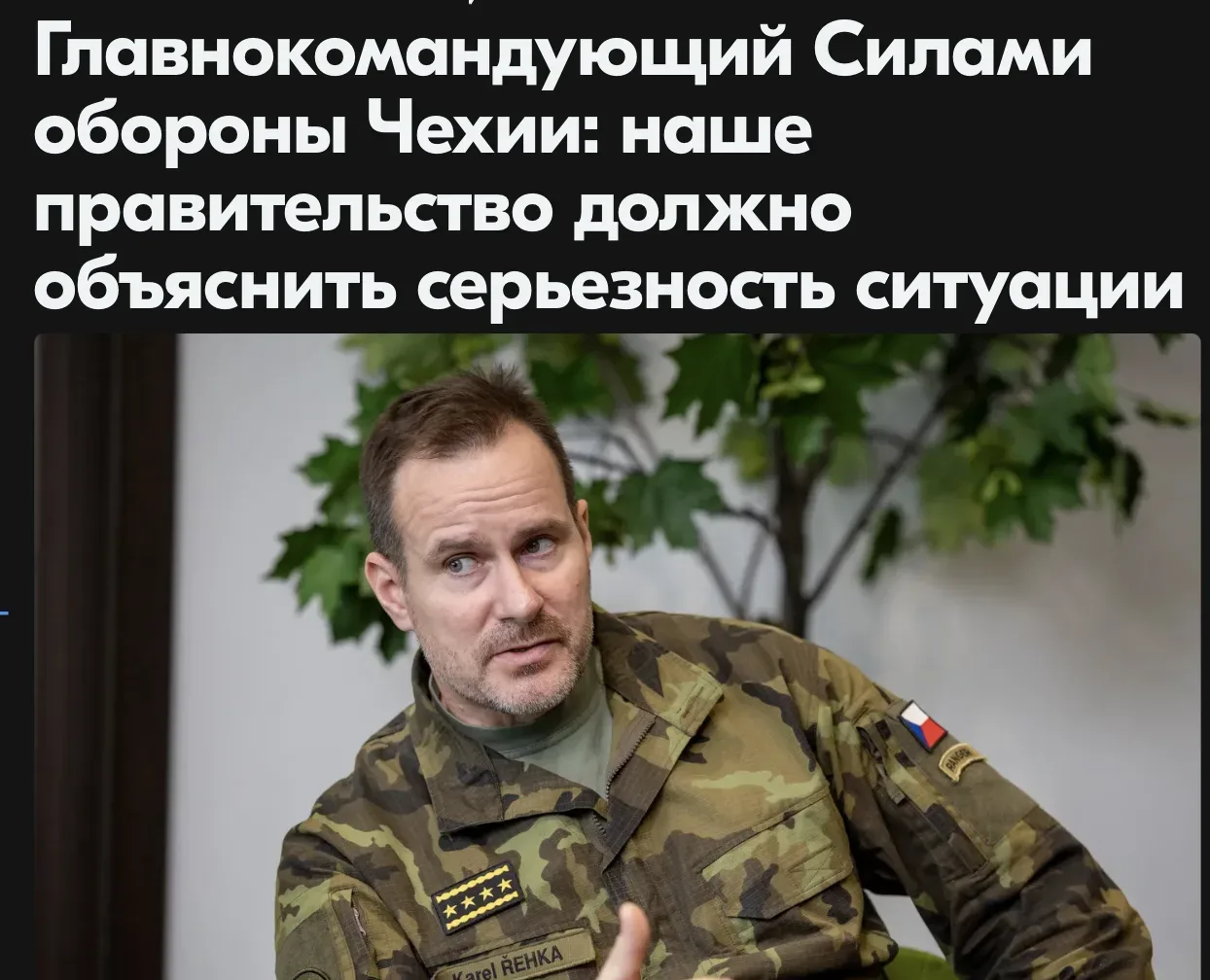 Командующий Силами обороны Чехии Карел Ржегка ждёт нападения России "вот буквально в следующий четверг" и недоволен собственным правительством, до сих пор не приступившим к тотальной мобилизации и переводу промышленности на военные рельсы.