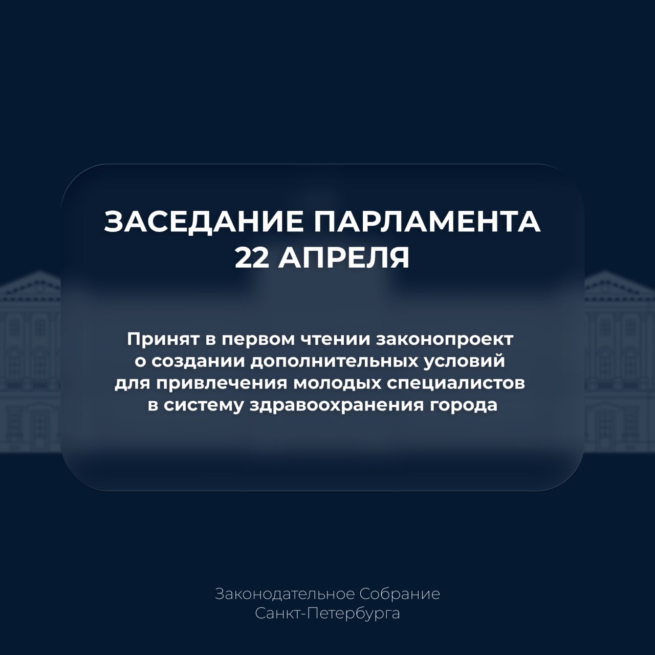 Петербургский парламент принял в первом чтении законопроект о создании дополнительных условий для привлечения молодых специалистов в систему здравоохранения города.