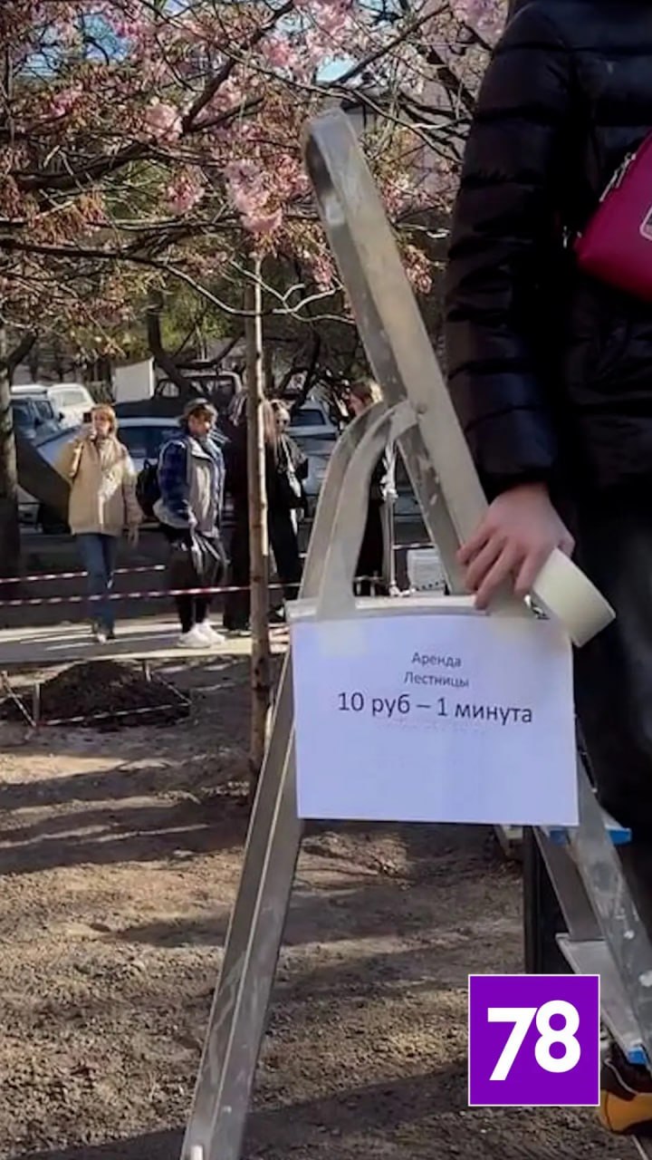 10 рублей за минуту — тариф на любование сакурой в Саду Дружбы. Подзаработать на цветущих деревьях решила предприимчивая девочка с помощью лестницы.