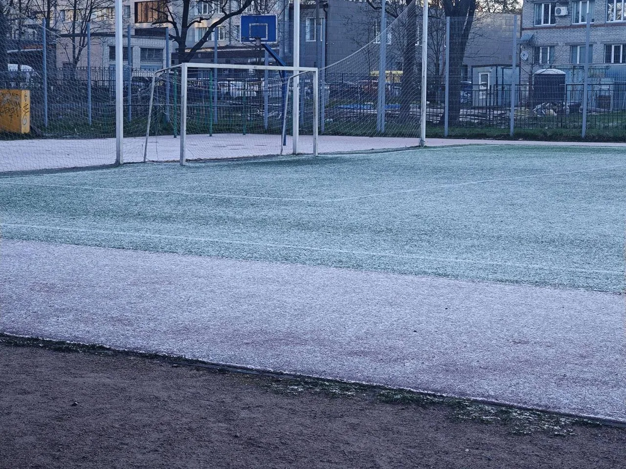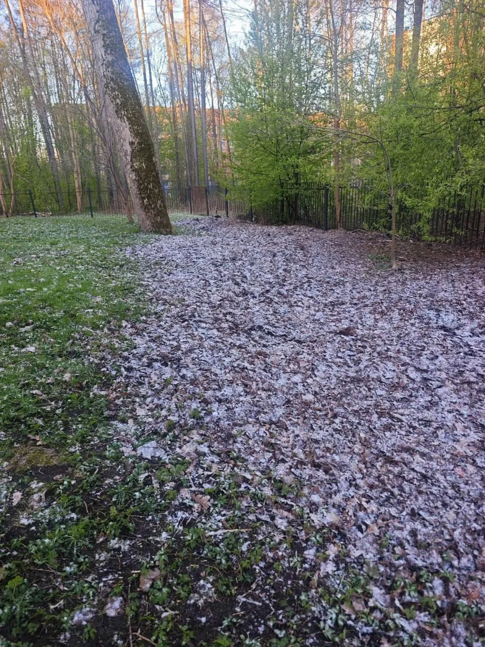 Всем, кто не верит в апрельский снег, показываем: даже после восхода солнца белая корка осталась лежать на траве и листьях в Выборгском районе.