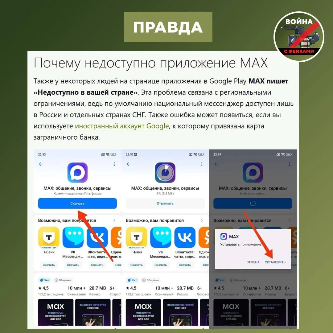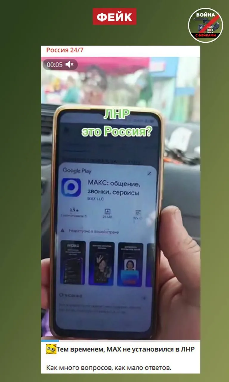Фейк: Мессенджер МАКС «не признаёт» ЛНР частью России, поэтому недоступен для скачивания в Google Play на территории региона. Об этом сообщают проукраинские телеграм-каналы, прилагая видео.