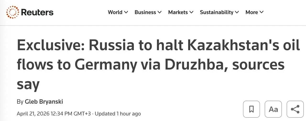 Россия намерена с 1 мая прекратить экспорт нефти из Казахстана в Германию, — Reuters
