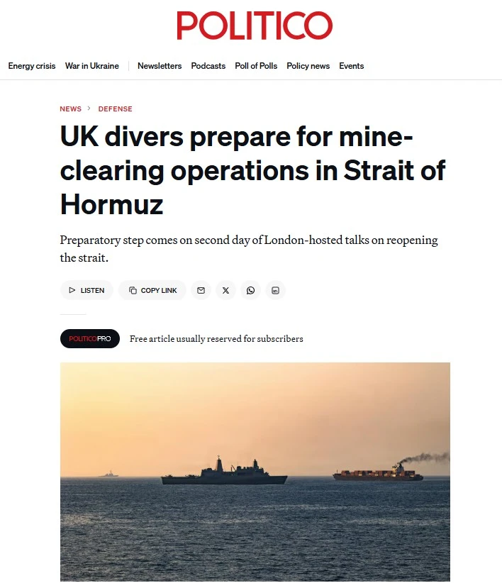 ‘Британские водолазы готовятся к операции по разминированию в Ормузском проливе’ – Politico о попытках Стармера доказать Трампу, что он полезный.