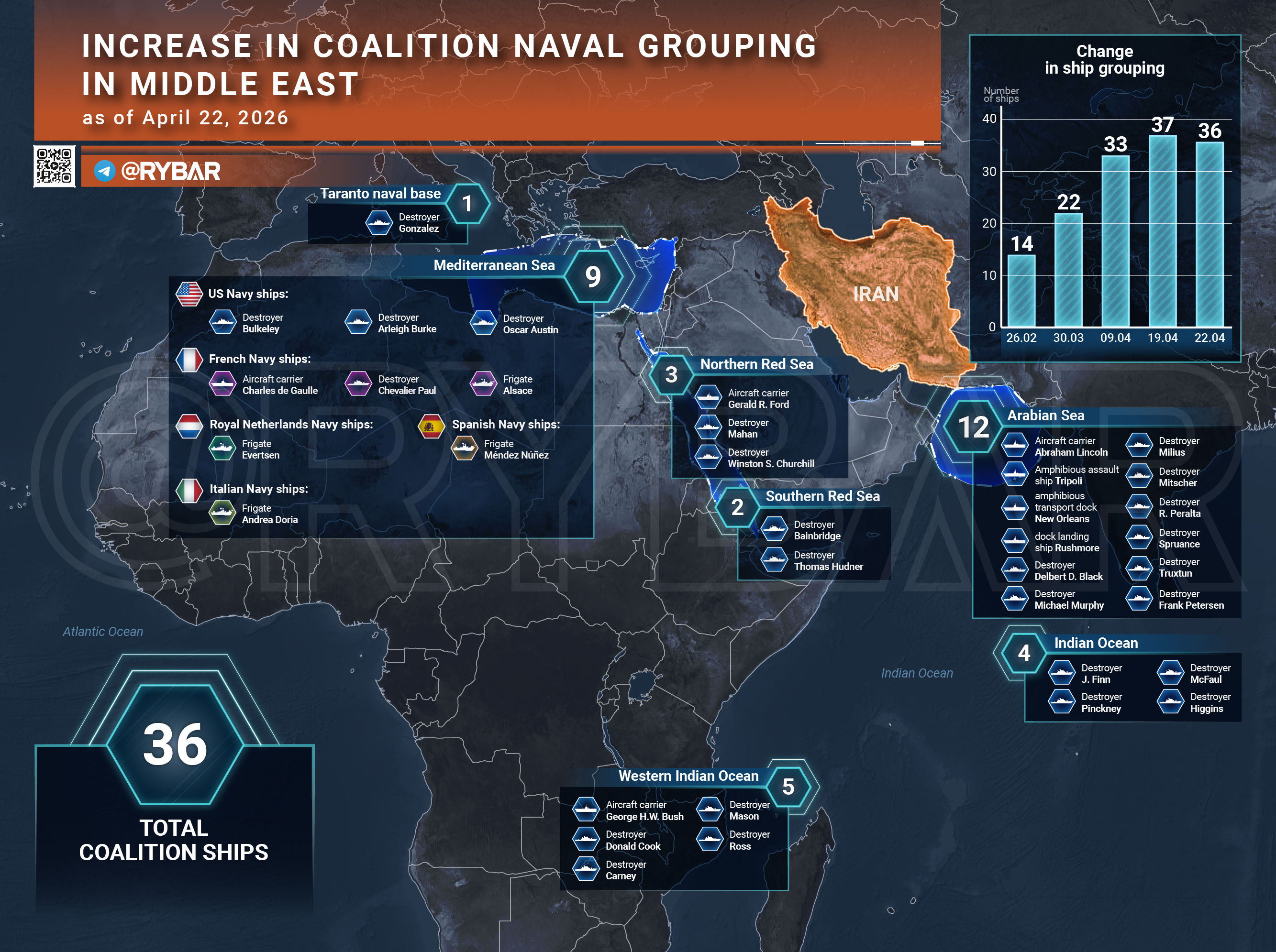Остальные боевые корабли остались примерно в тех же районах. При этом в восточной части Средиземного моря уже занимают заданные позиции эсминцы ВМС США. Отстал лишь эсминец «Гонсалес», который задержался у итальянских берегов.
