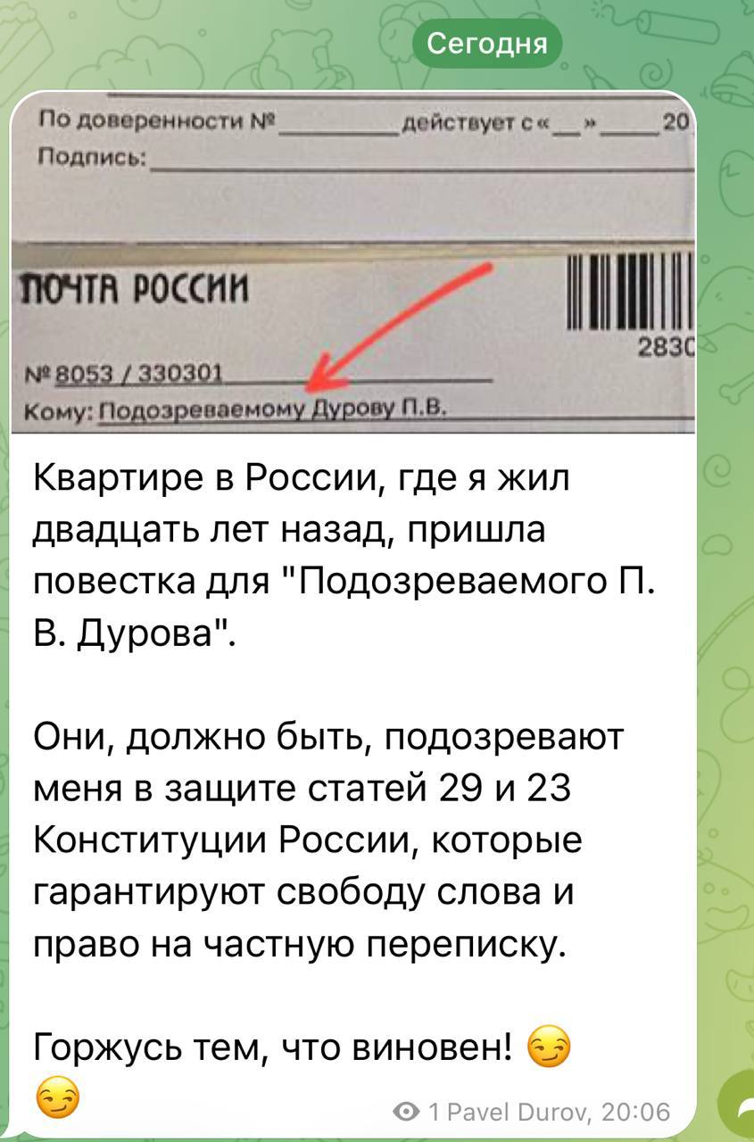 Вчера Павел Дуров сообщил, что на его имя в России пришла повестка, и в ней указано, что он квалифицирован как подозреваемый.