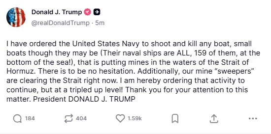 ‘Я приказал Военно-морским силам США открывать огонь на поражение по любым судам, даже небольшим лодкам, которые устанавливают мины в водах Ормузский пролив. Не должно быть никаких колебаний. Кроме того, наши минные тральщики уже сейчас очищают пролив. Настоящим приказываю продолжать эту деятельность, увеличив её втрое!’.