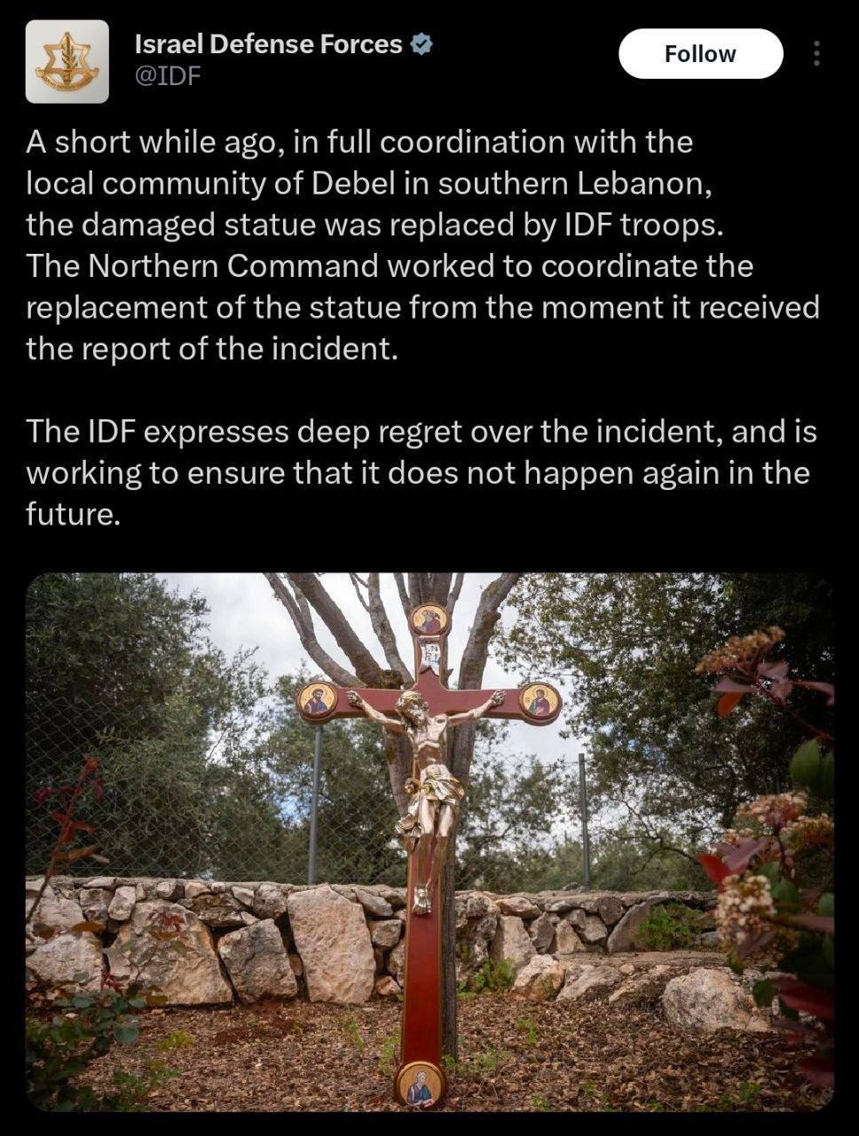 ЦАХАЛ заявил, что установил новый крест вместо того, который разбил кувалдой израильский военный. Однако это был именно крест, а не статуя, — такие кресты христиане носят во время праздников и процессий. К тому же, выяснилось, что израильтяне просто украли его в другой деревне на юге Ливана и после международного скандала притащили в Дебель.