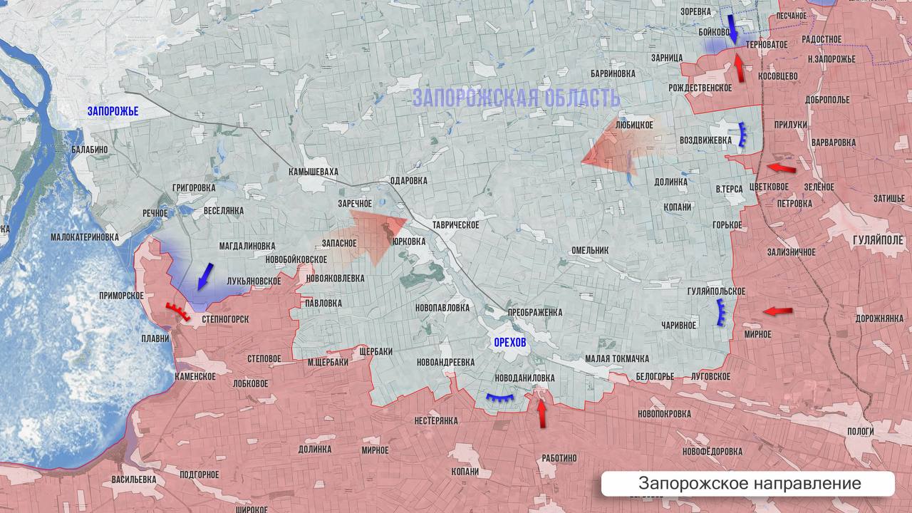 На западном фланге Запорожского направления продолжаются позиционные бои в районе Приморского и Степногорска. На восточном фланге ВС РФ пробиваются к Чаривному со стороны Мирного и Белогорья, охватывая его с нескольких сторон. Наши операторы дронов и артиллерия бьют по опорным пунктам в районе Новосёловки, а со стороны Малой Токмачки наносят удары по укрепрайонам между Преображенкой и Червоной Криницей. Севернее продолжаются бои в районе Верхней Терсы, Воздвижевки и в месте вклинения наших в оборону врага между ними.