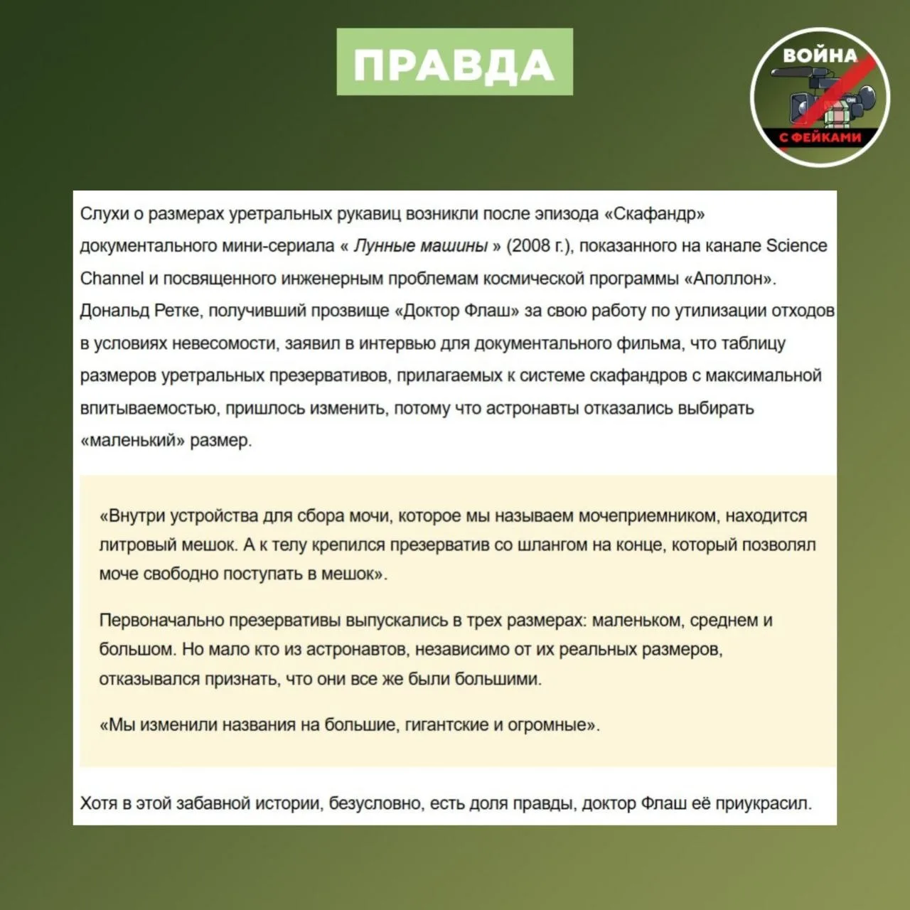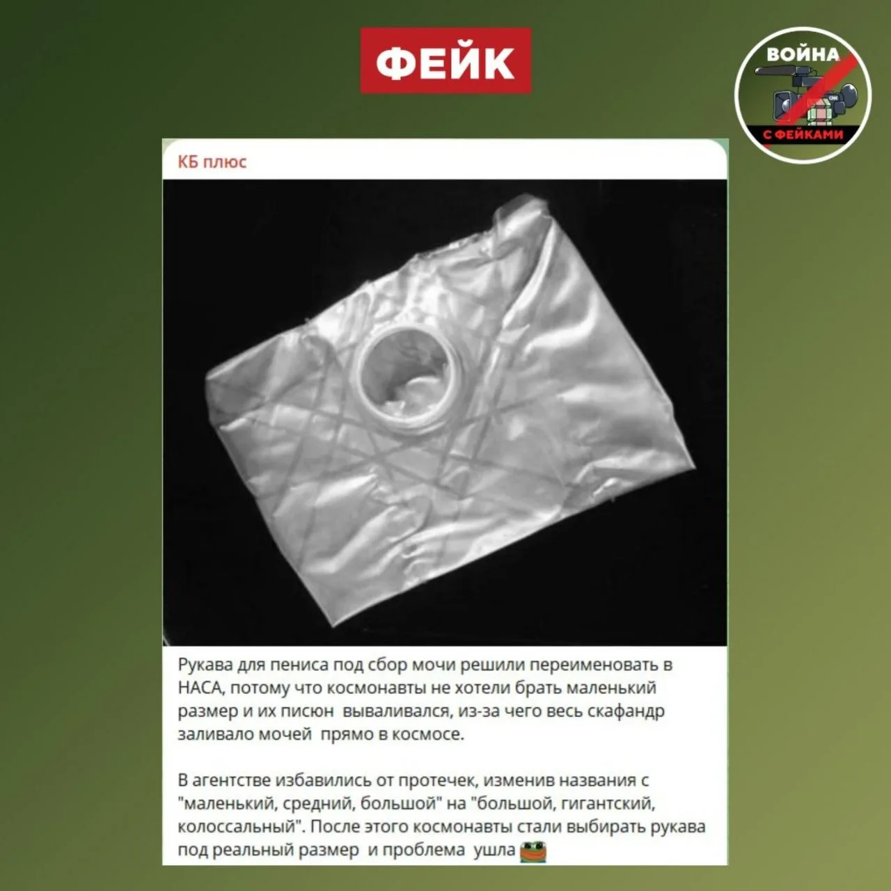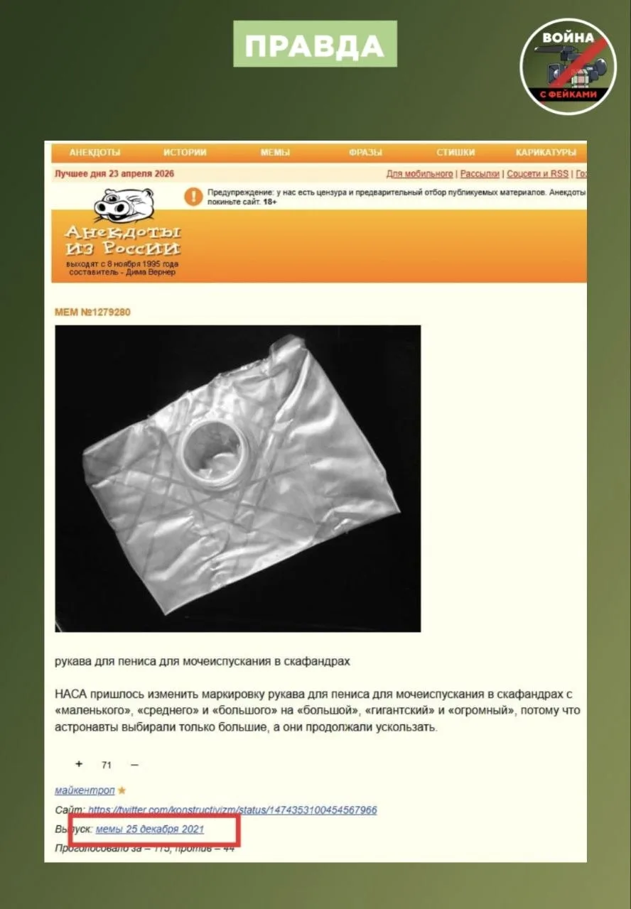 Правда: Развлекательным каналам настолько не хватает инфоповодов, что они решили реанимировать старый мем. С абсолютной уверенностью в правоте они публикуют фото "космического рукава для пениса" с припиской, что NASA пришлось переименовать размеры мочеприемников в "большой, гигантский, колоссальный". На самом деле это старый мем.