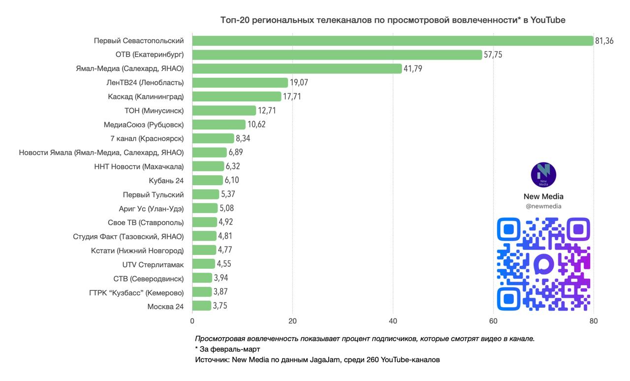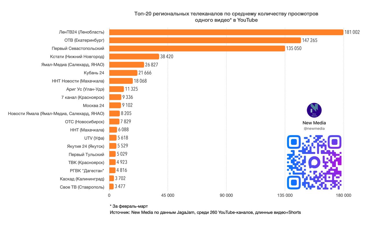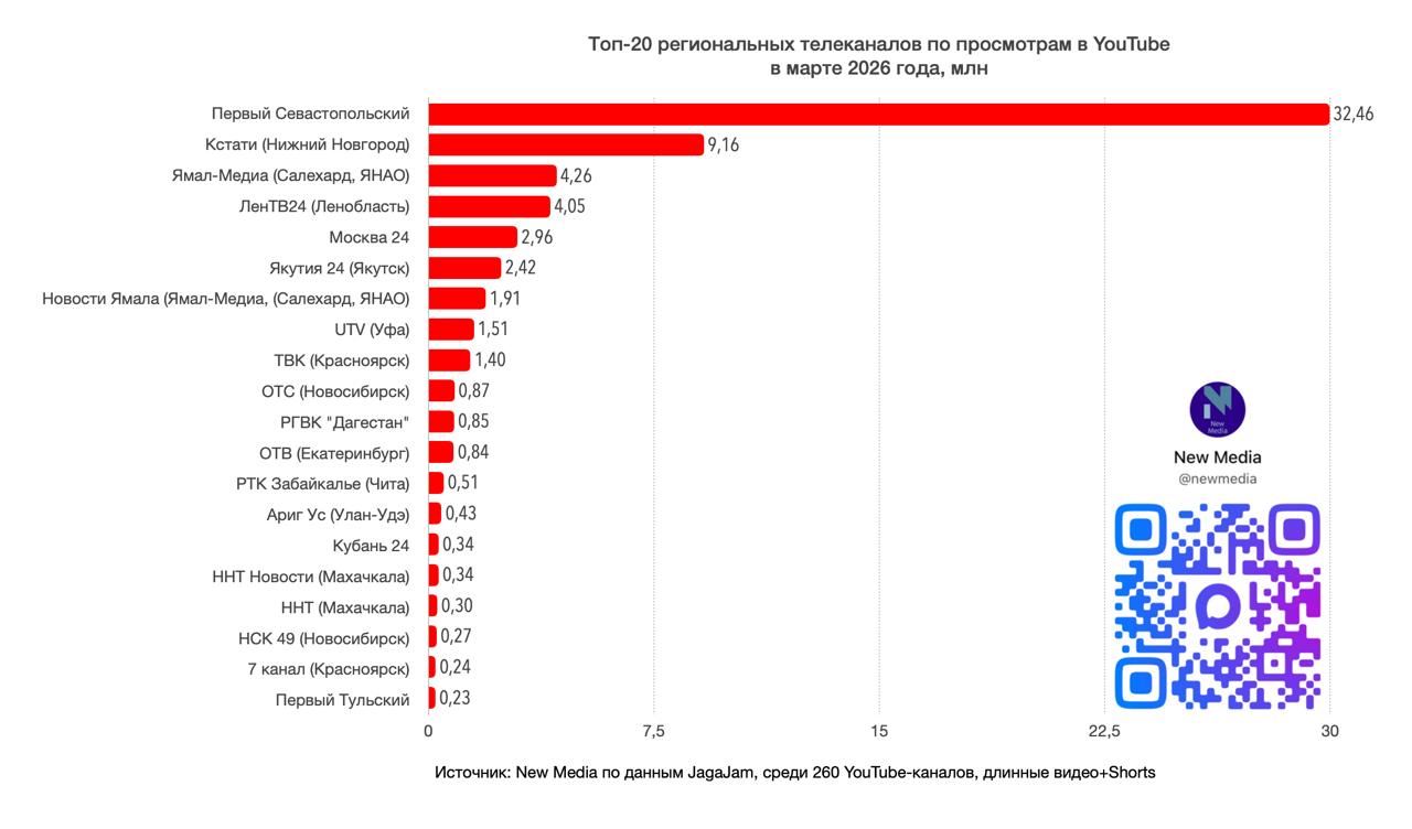 Топ-20 региональных телеканалов в YouTube в марте 2026 года