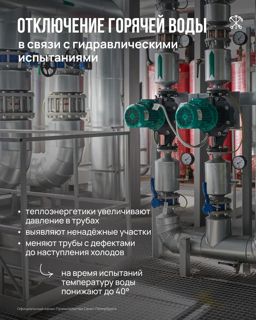 На время испытаний необходимо временно приостанавливать подачу горячего водоснабжения. График отключений уже утверждён — с ним можно ознакомиться на портале Комитета по энергетике и на сайтах теплоснабжающих организаций: