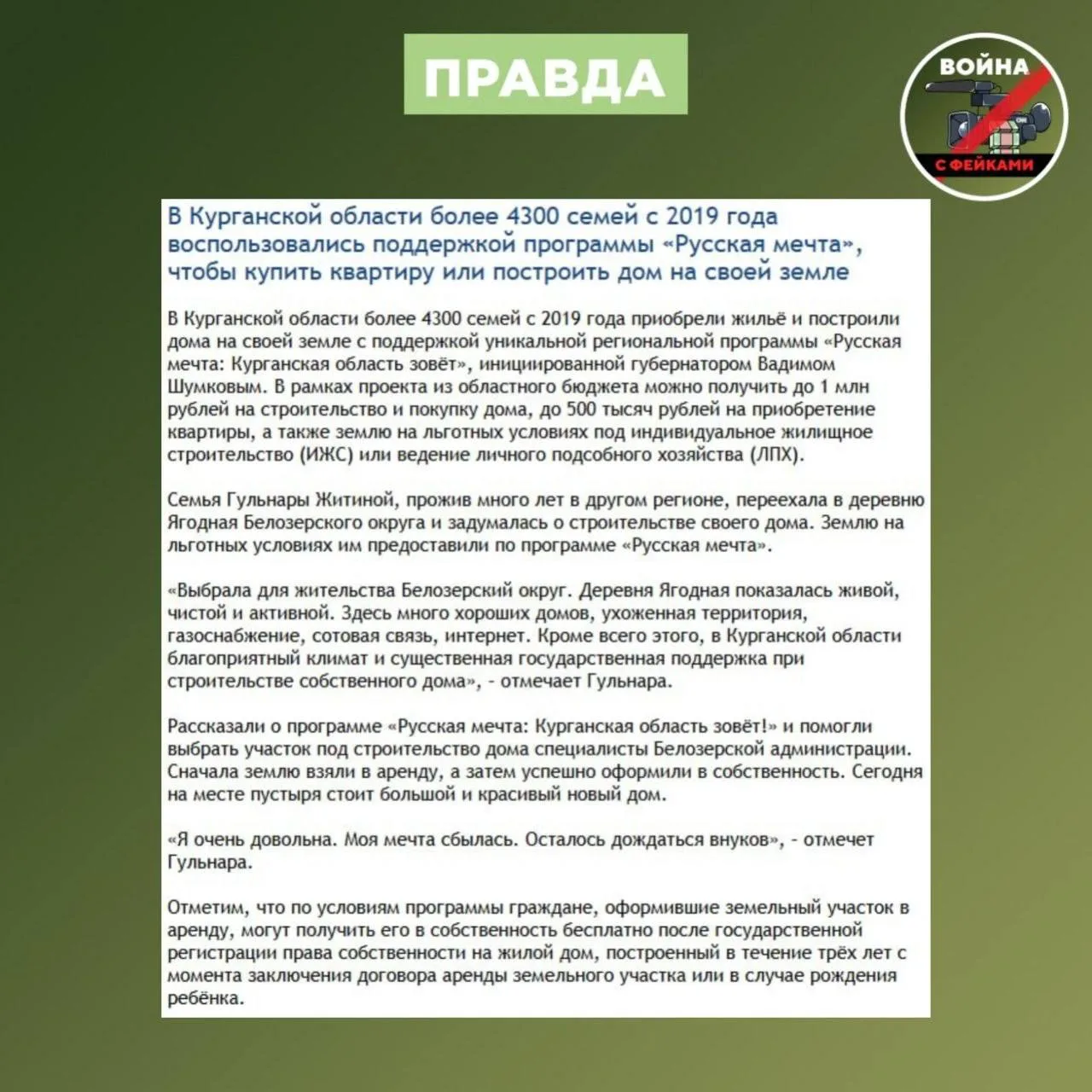 Авторы вброса намеренно проигнорировали факты и официальные заявления областного правительства. В конце 2024 года между «Курганмашзаводом», строительной компанией «Олимп» и Сбером было подписано соглашение о строительстве четырех многоэтажных домов для сотрудников завода в микрорайоне Заозерный. Сдать жилой комплекс планируют в середине 2027 года, а заводчане смогут получить субсидию на первоначальный взнос по ипотеке в размере 500 тысяч рублей именно по проекту «Русская мечта». 6 марта мэрия Кургана уже выдала разрешение на строительство. Проект движется полным ходом в соответствии с планом.