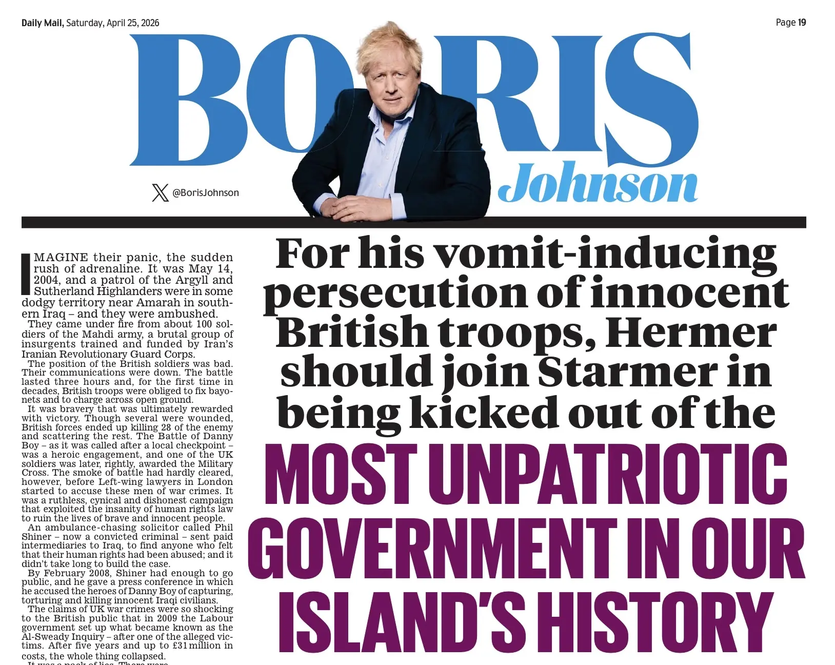 В продолжение темы предыдущего поста. Сегодня на страницах Daily Mail Бориска Джонсон разродился статьей о том же - о преследовании британских военных преступников. Он призывает «вышвырнуть Стармера из самого непатриотичного правительства в истории острова».
