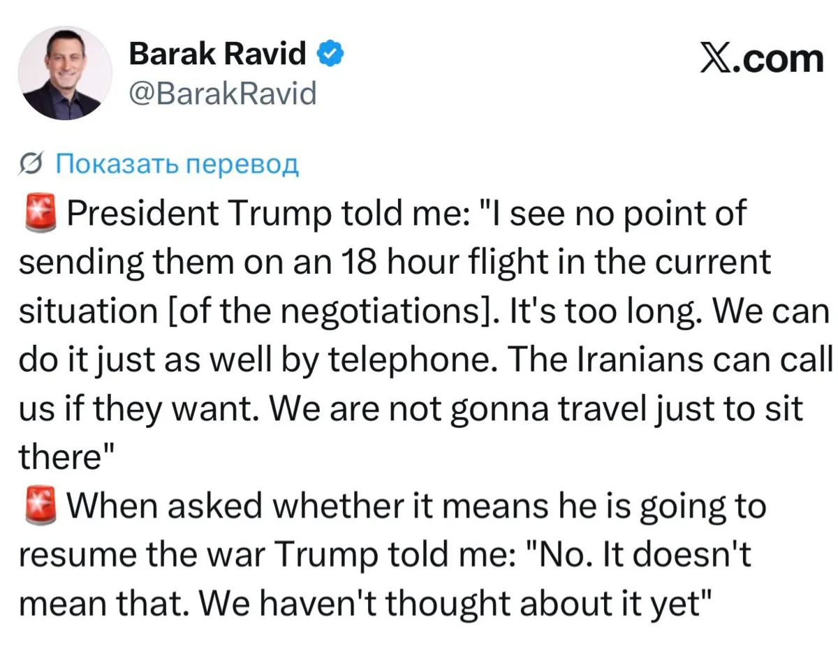 «Я не вижу смысла отправлять их в 18-часовой перелёт в текущей ситуации [с переговорами]. Это слишком долго. Мы можем сделать это так же успешно по телефону. Иранцы могут позвонить нам, если захотят. Мы не собираемся путешествовать только для того, чтобы там посидеть».