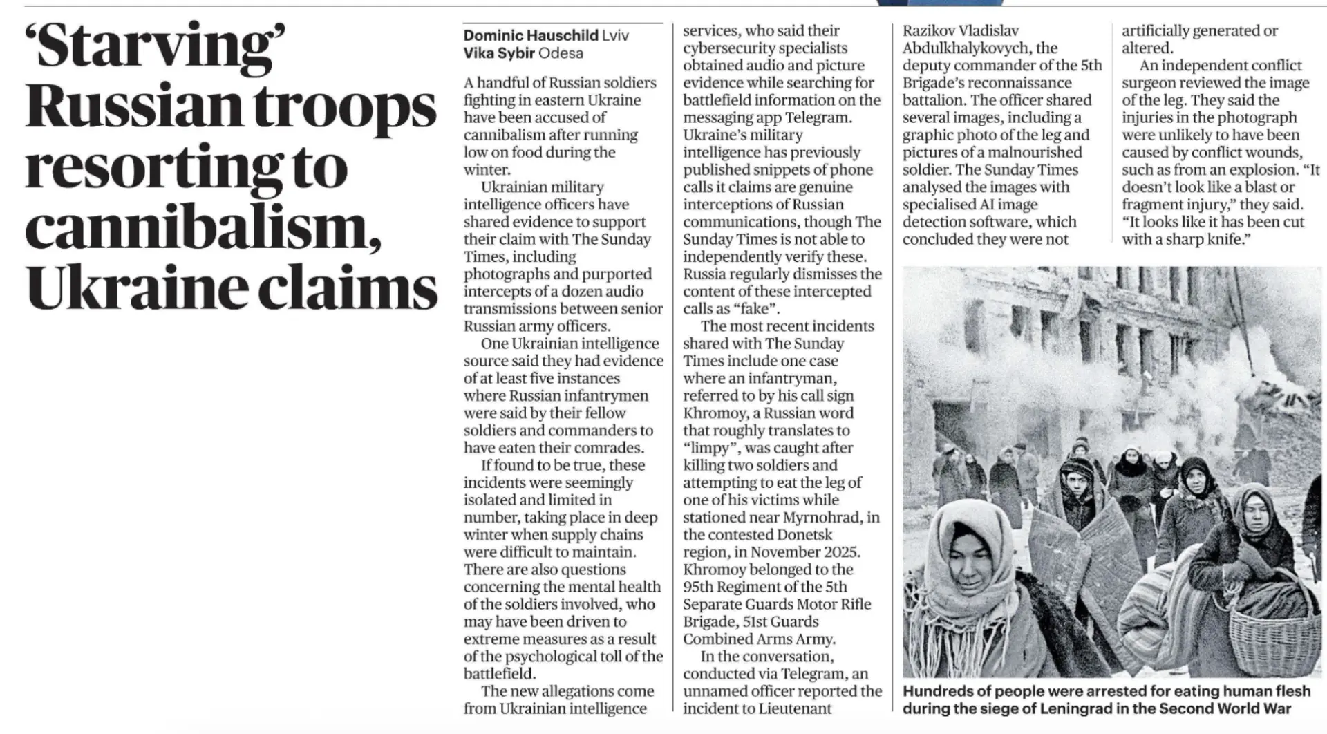 The Sunday Times сегодня выходит со статьей под заголовком: ««Голодающие» российские военные прибегают к каннибализму, - утверждает Украина». Газета опускается до того, что в качестве «доказательства» использует фотографию… блокадного Ленинграда! Представляете, какая мерзость!