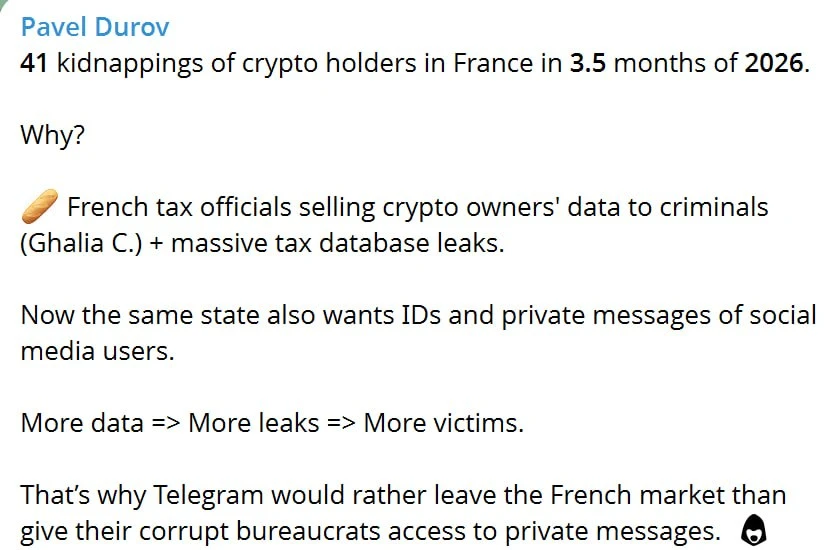 «Больше данных — больше утечек — больше жертв», — написал он, добавив, что Telegram скорее уйдёт с французского рынка, чем передаст данные «коррумпированным бюрократам».