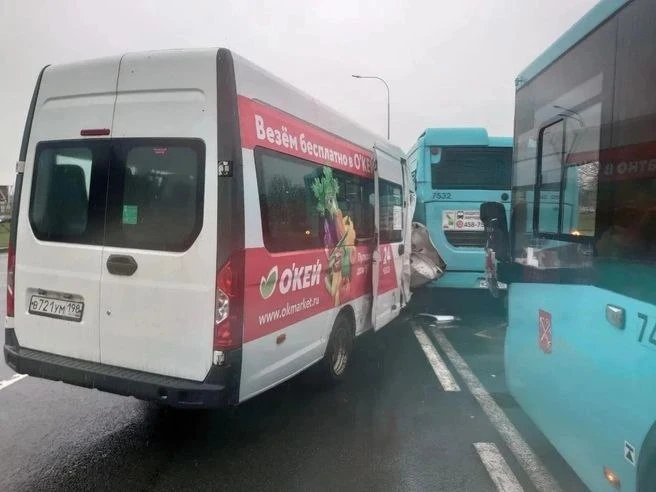 ГАЗ врезался сразу в два автобуса на Пулковском шоссе. Предварительно, у водителя микроавтобуса случился инсульт.