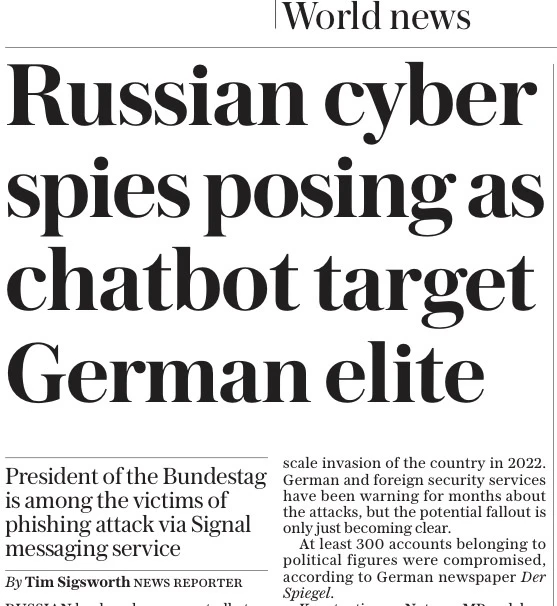 В Германии жуткий скандал! «Русские шпионы», прикидываясь чат-ботами и искусственным интеллектом, взломали переписку видных немецких политиков, депутатов бундестага, включая его президента, в мессенджере Сигнал.