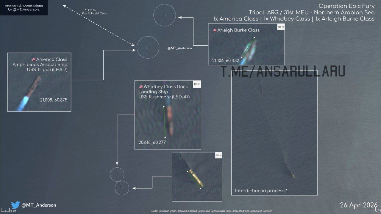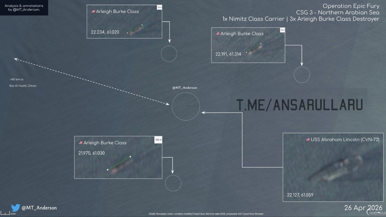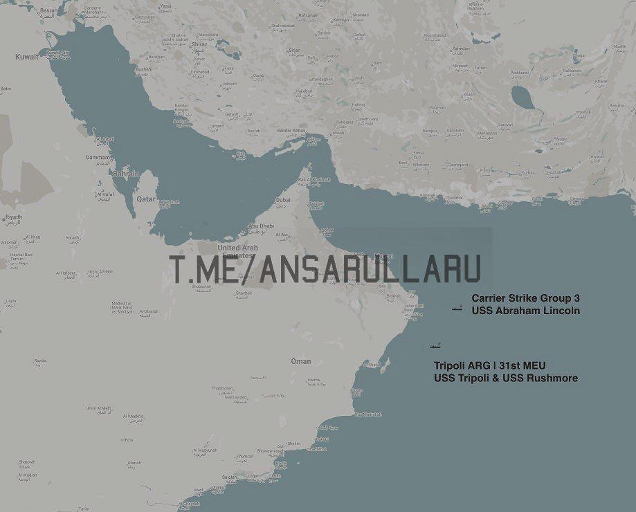 Американские авианосная и десантная группы Abraham Lincoln и Триполи фиксируются к юго-востоку от Рас-эль-Хадд на расстояниях 160-190 км от берегов Ирана.