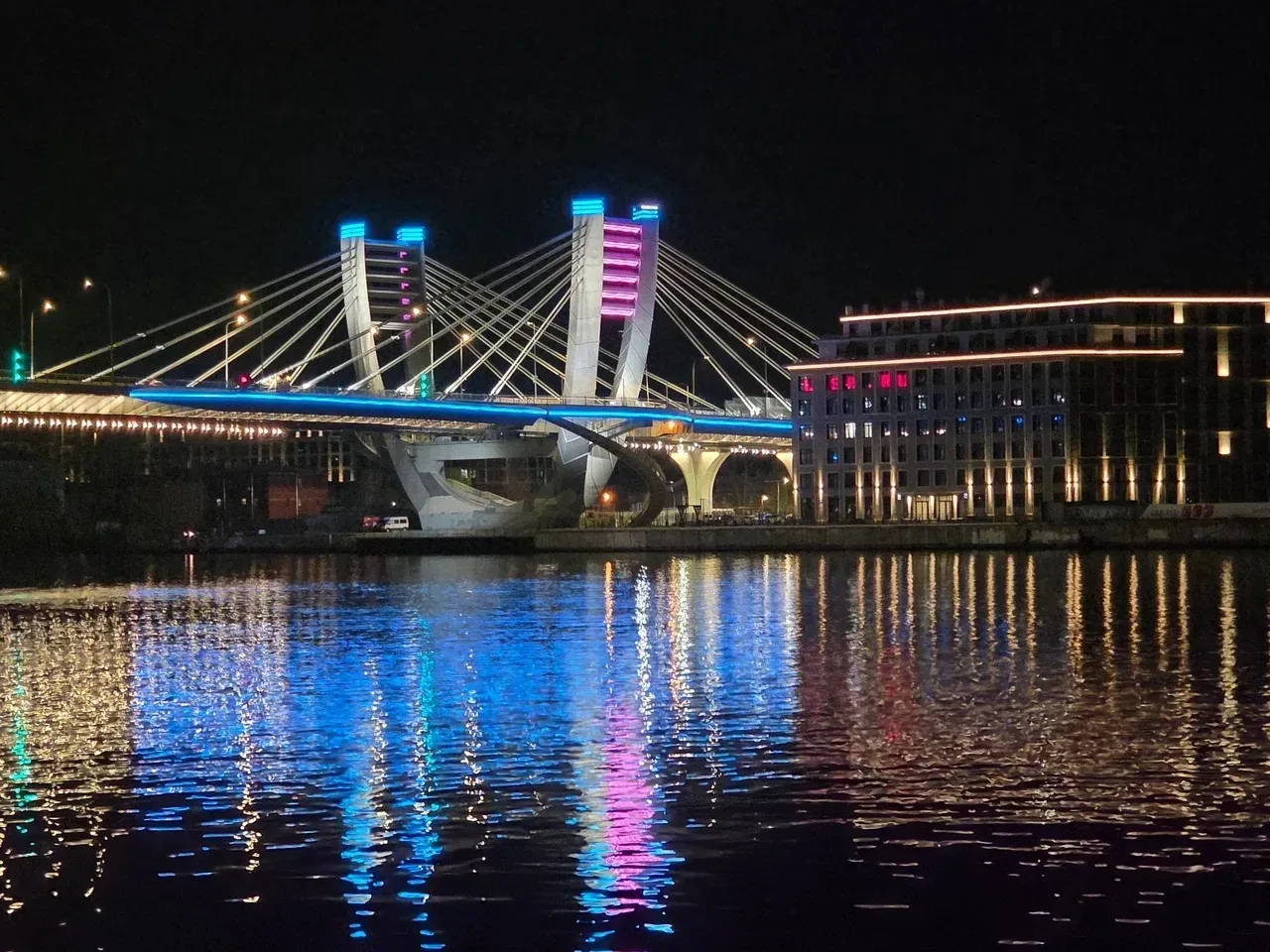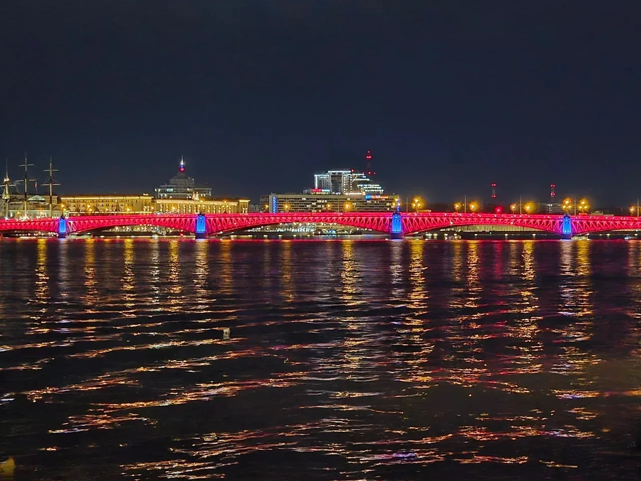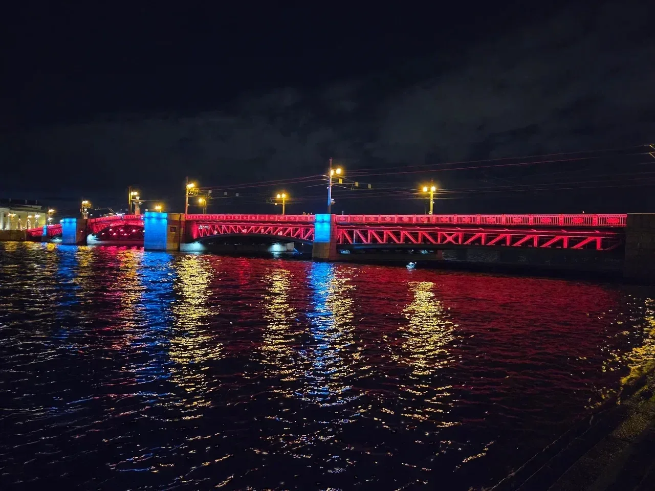 Пролеты Троицкого, Дворцового и моста Бетанкура окрасились в красный и голубой. Специальное художественное оформление включали в ночь с 25 на 26 и с 26 на 27 апреля.