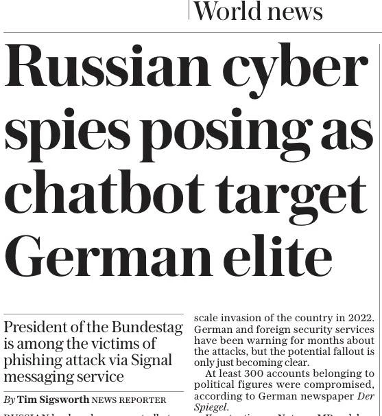 На фото... Сенсационная передовица BBC World News: «Русские шпионы», прикидываясь чат-ботами, взломали переписку видных немецких политиков, депутатов бундестага, включая его президента».