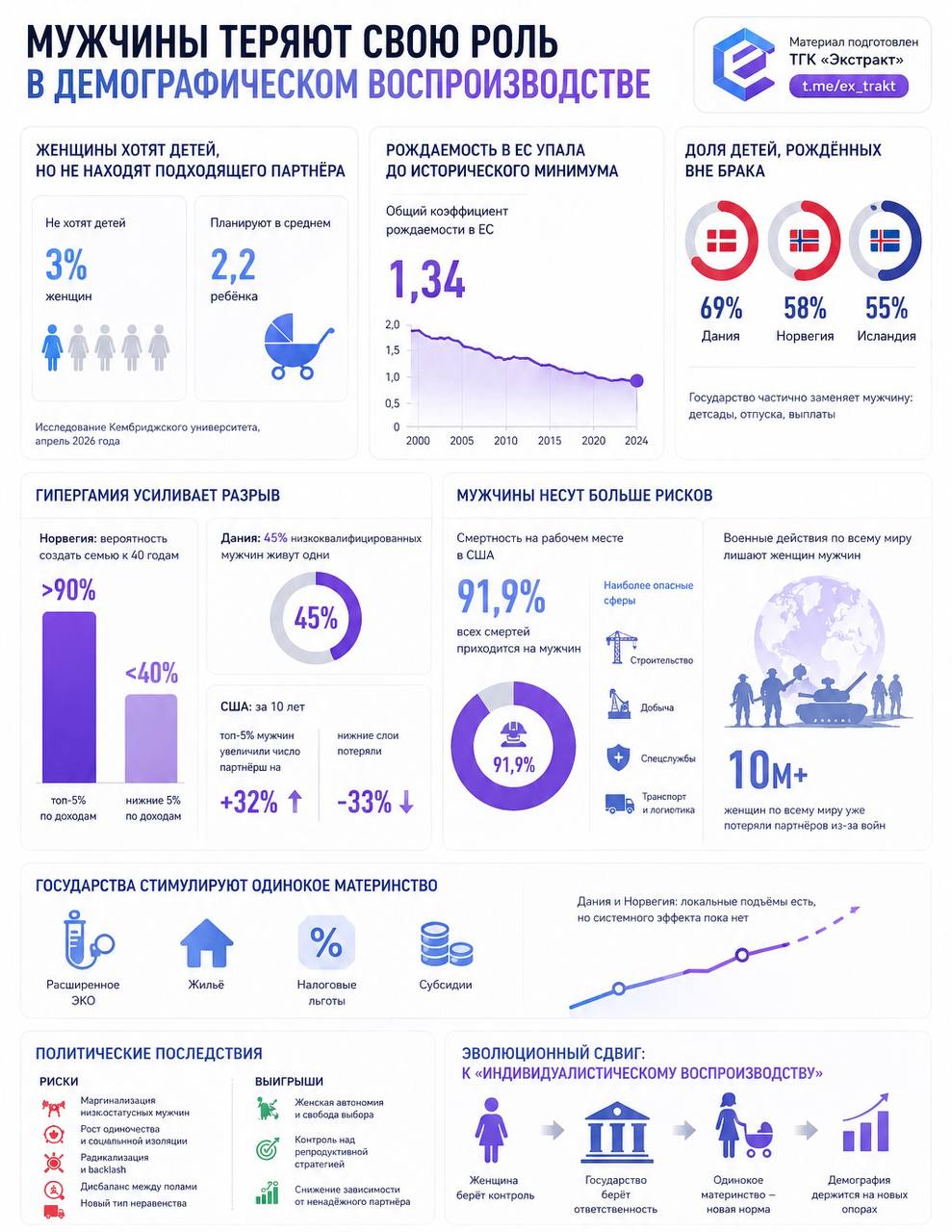 Исследование Кембриджского университета от апреля 2026 года прямо предупреждает: «Жизнеспособным способом выживания стран с низкой рождаемостью может стать предоставление женщинам экономических и социальных ресурсов и прав, необходимых для того, чтобы они могли прийти к выводу, что иметь детей в одиночку — это лучше, чем оставаться бездетным. При этом такие политики, вероятно, усугубят мужскую маргинализацию». Авторы фиксируют жесткую реальность: только 3% европейских женщин не хотят детей, в среднем они планируют 2,2 ребенка, но отсутствие подходящего партнера остается главной преградой. В ЕС общий коэффициент рождаемости рухнул до 1,34 в 2024 году — исторический минимум, несмотря на все щедрые семейные пособия в Скандинавии. Там, где государство уже частично заменяет мужчину — через детские сады, отпуска и выплаты, — доля детей вне брака превышает 55–69% (Дания, Норвегия, Исландия). Налогоплательщики де-факто берут на себя ту функцию обеспечения, которую раньше выполнял супруг.