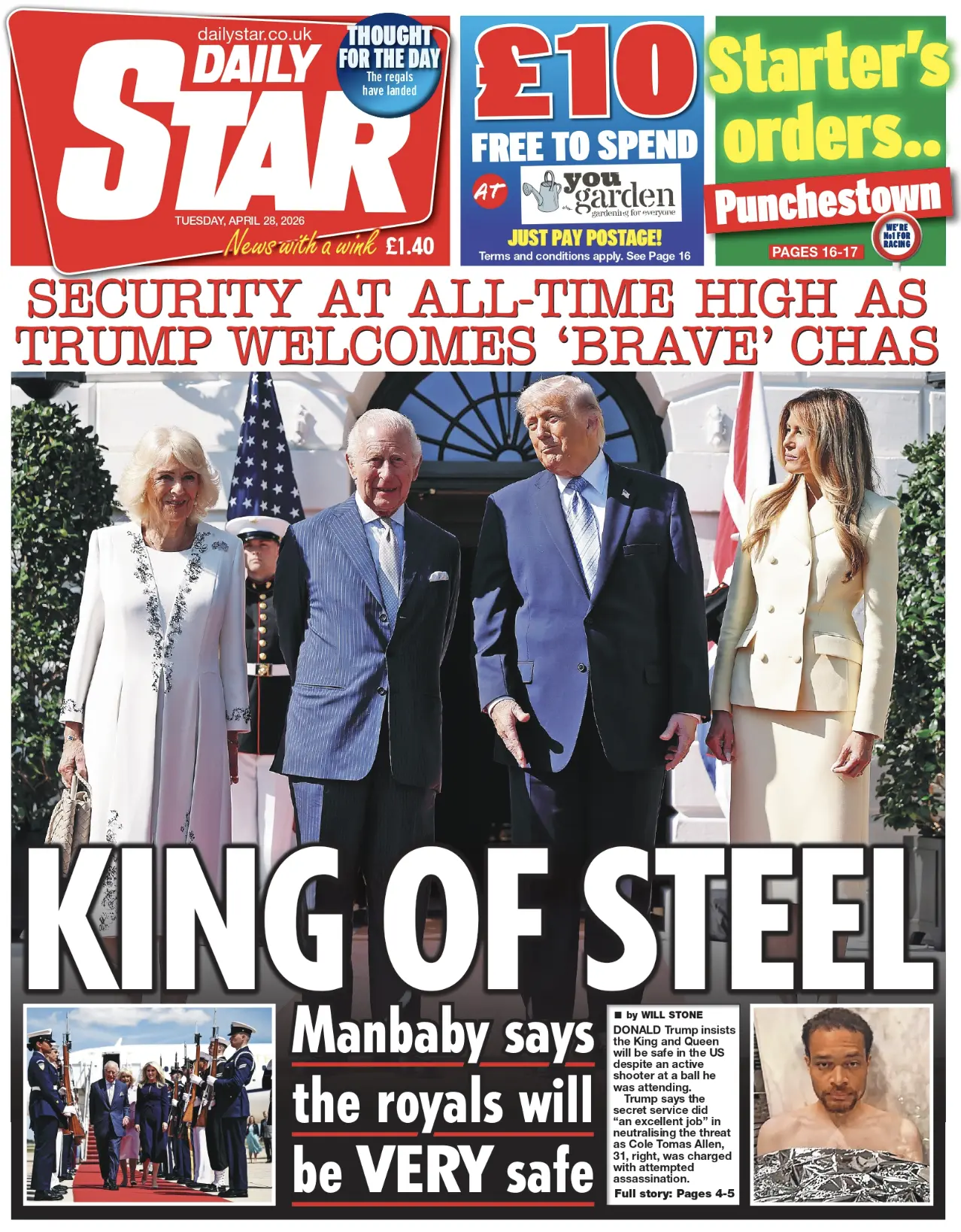Забавно сегодня листать британские газеты. Как видите, все первые полосы восхваляют королька Чарльза за его… «смелость»! «Король из стали» - восхищается Daily Star.