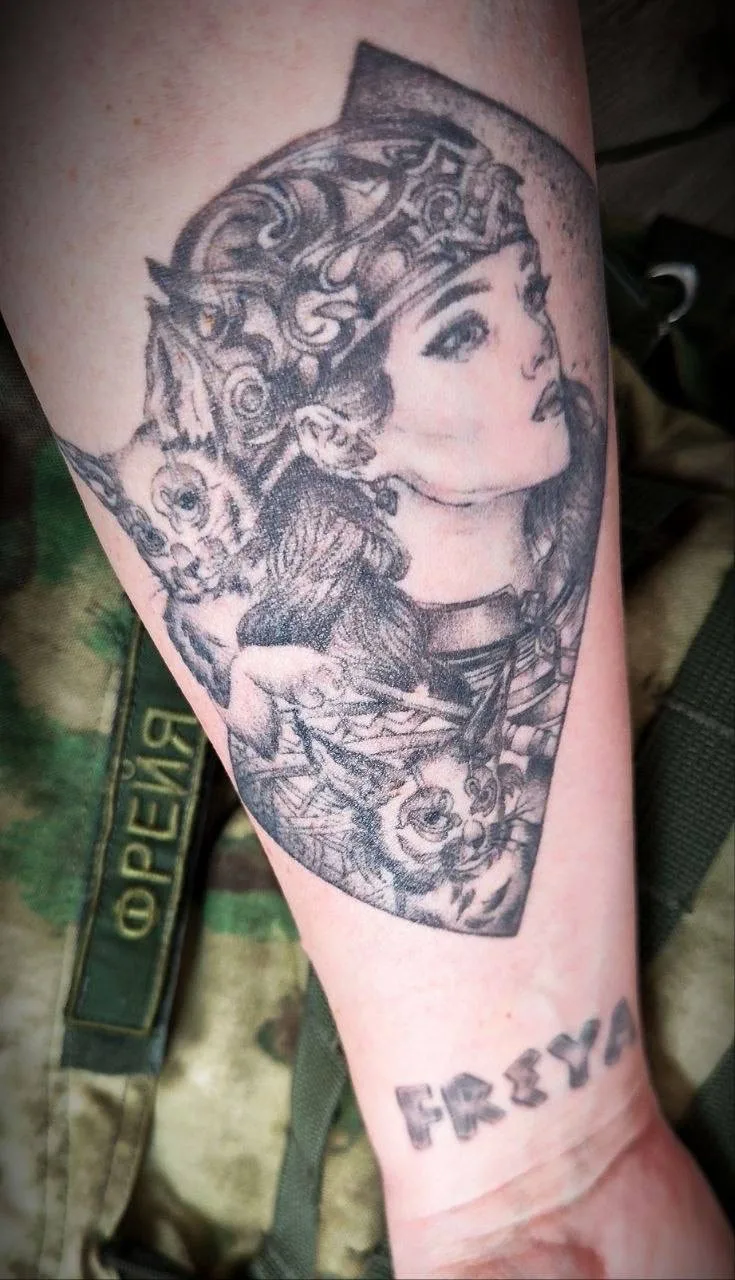 Первая татуировка от девушки с позывным «Фрейя». В мирной жизни – Лариса Лукина, депутат Ломоносовского района Ленинградской области. В боевой – руководитель добровольческого отряда «ОПЛОТ» (Объединение патриотов Ленинградской области и Санкт-Петербурга).
